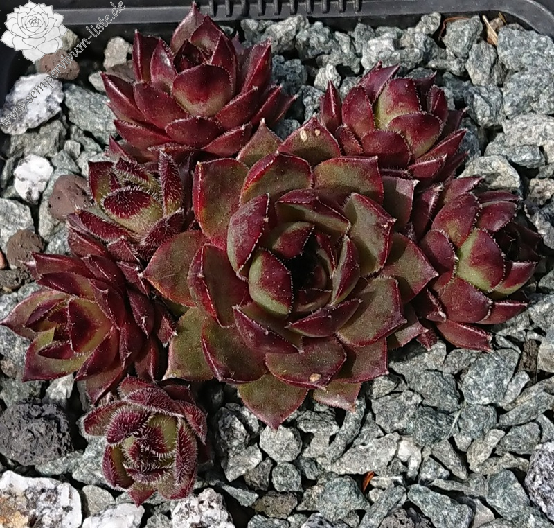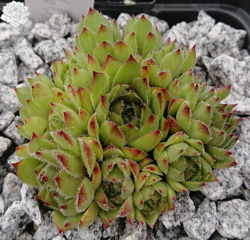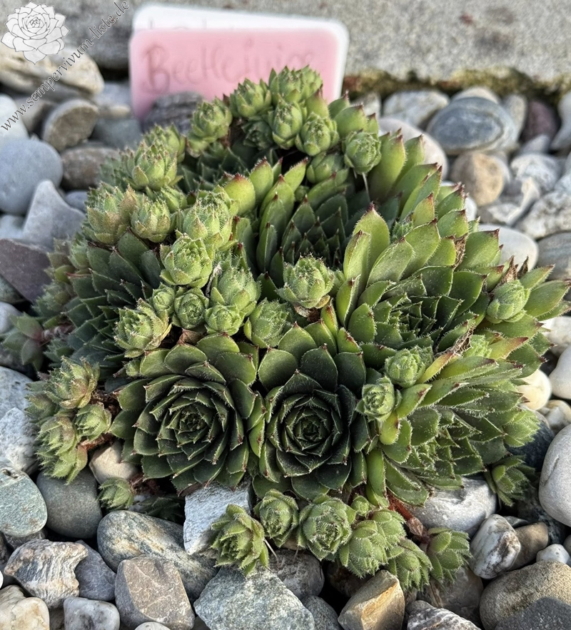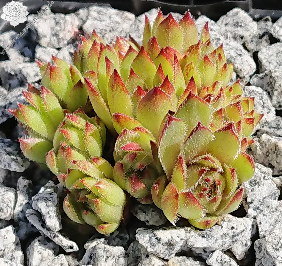 ‘Beetlejuice’ ist eine eigene Züchtung aus 2021 (Sämling von ‘Moby Dick’). Die Sorte fällt vor allem durch ihre auffällig starke Behaarung auf – die Blätter sind dicht mit feinen, silbrig-weißen Härchen besetzt, die der Pflanze ein samtiges, fast pelziges Aussehen verleihen. Die Rosetten sind mittelgroß und zeigen einen schönen Farbwechsel: Im Frühjahr und Frühsommer leuchtet sie in kräftigem Limettengrün mit intensiv roten Blattspitzen, im Herbst und bei kühleren Temperaturen nimmt sie burgunderrote Töne an. Besonders hervorzuheben ist ihre hohe Kindelfreudigkeit – sie bildet sehr zuverlässig viele kräftige Ableger. Die Pflanze ist robust, wächst kräftig und zeigt sich wetterfest. Alle meine Sempervivum wachsen ausschließlich in sehr mineralischem Substrat. Auch bei extremen Temperaturen und wechselhafter Witterung zeigt sie sich sehr stabil und pflegeleicht.