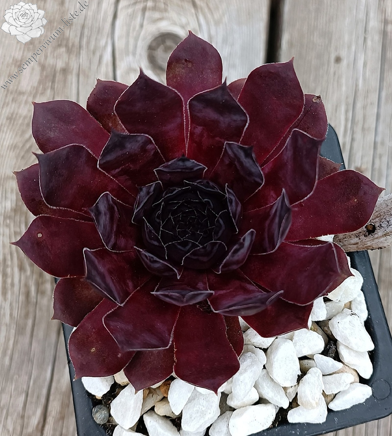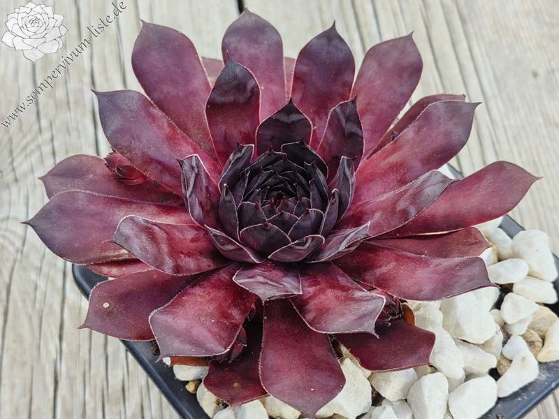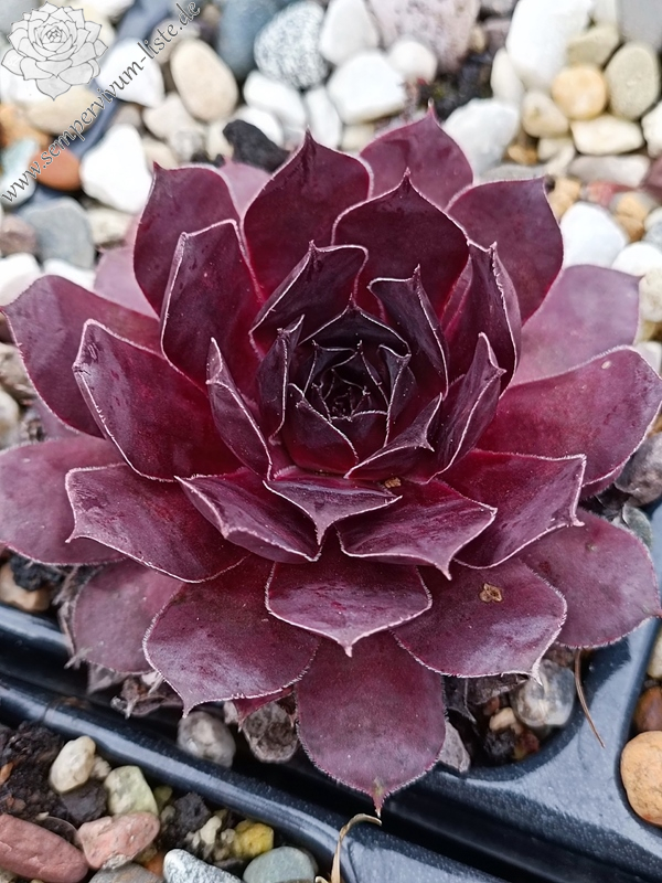 Die großen Rosetten sind fast schwarz. Sie behalten ihre Farbe im Sommer sehr gut. Die Kamera gibt die Farbe leider nicht wieder. Die Abstammung ist unbekannt
