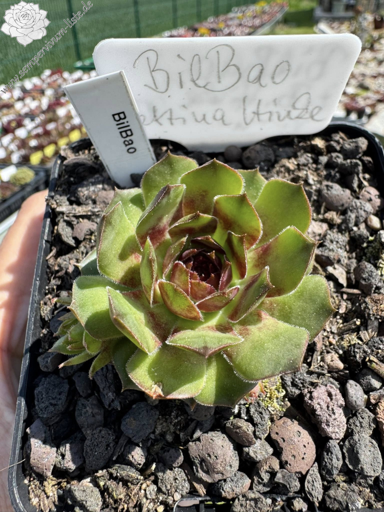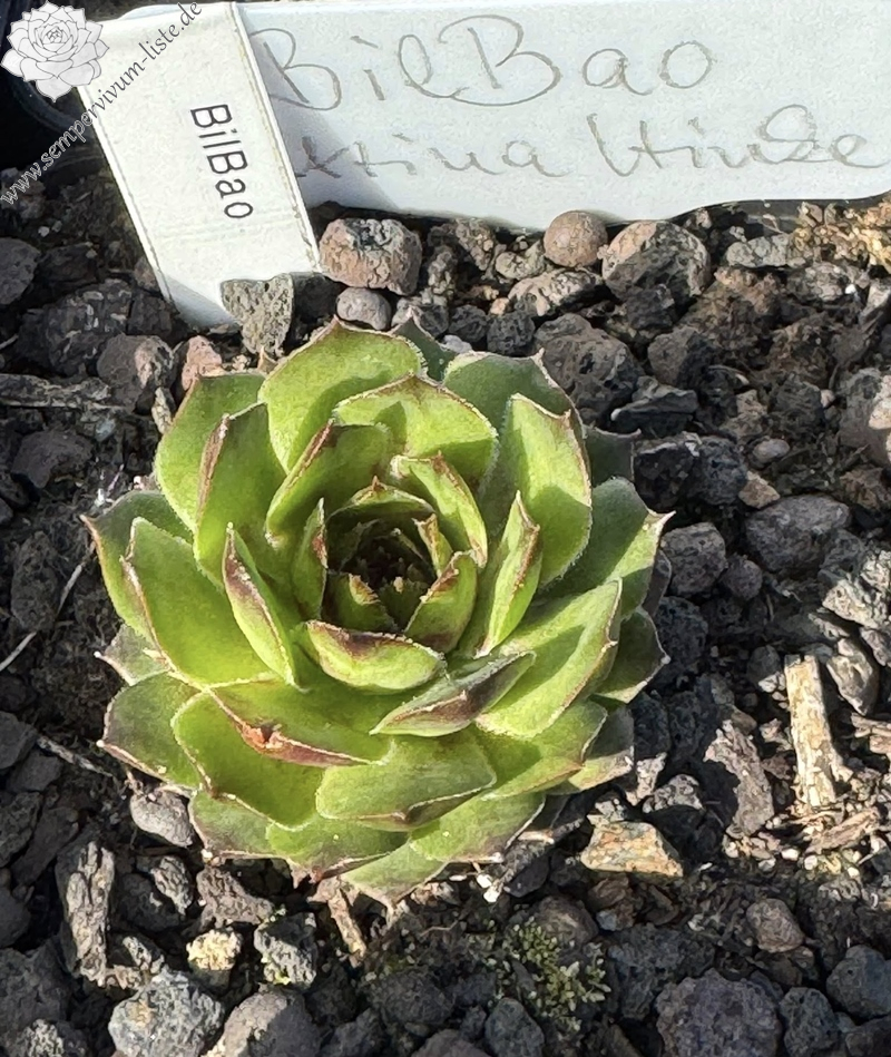 Er macht kleine, 2-3 cm große, kompakte Rosetten, die im Frühling ziemlich unscheinbar sind. Ab Mai verfärben sich seine glatten Blätter in ein zartes Hellgrün, gepaart mit einem Hauch von Rot, was verstärkt in der Mitte erscheint, jedoch sich schon ab Juni über die gesamte Rosette verteilt. Die hellgrüne Grundfarbe nimmt jetzt einen gelblicheren Farbton an. Im Sommer erscheint die gesamte Farbpalette mehr orange, was sich bis zum Herbst verflüchtigt und das Hellgrün wieder dominiert. Nur die Blattspitzen sind dann noch orange. 'BilBao' ist eine robuste Sorte, die schöne Polster bildet.