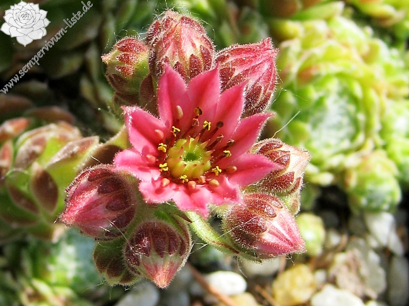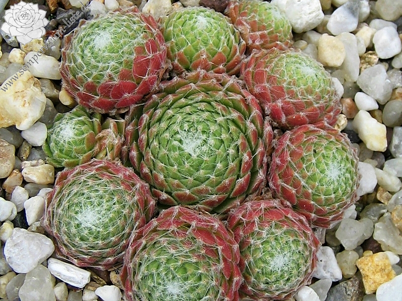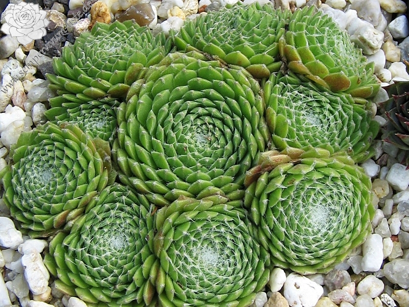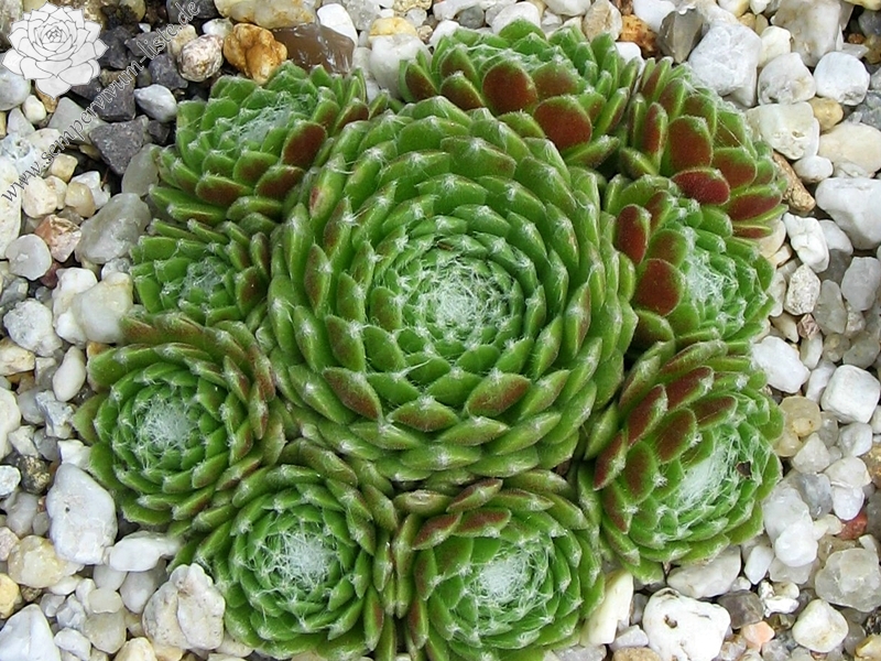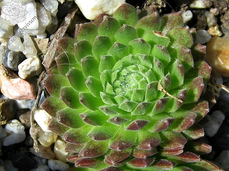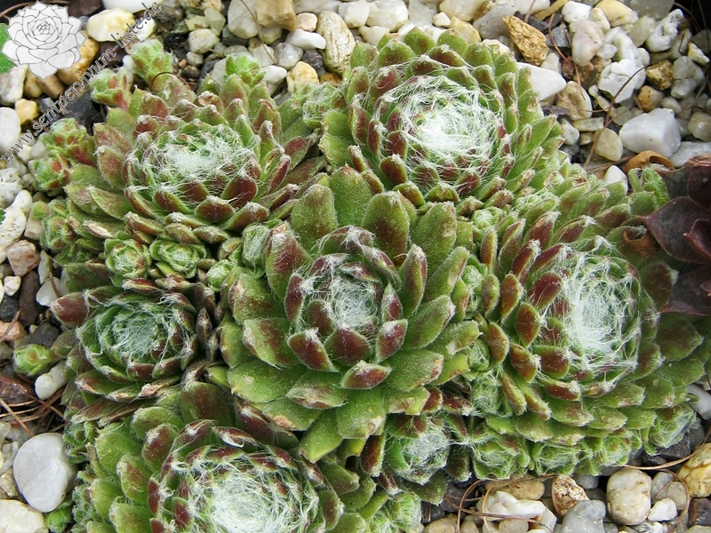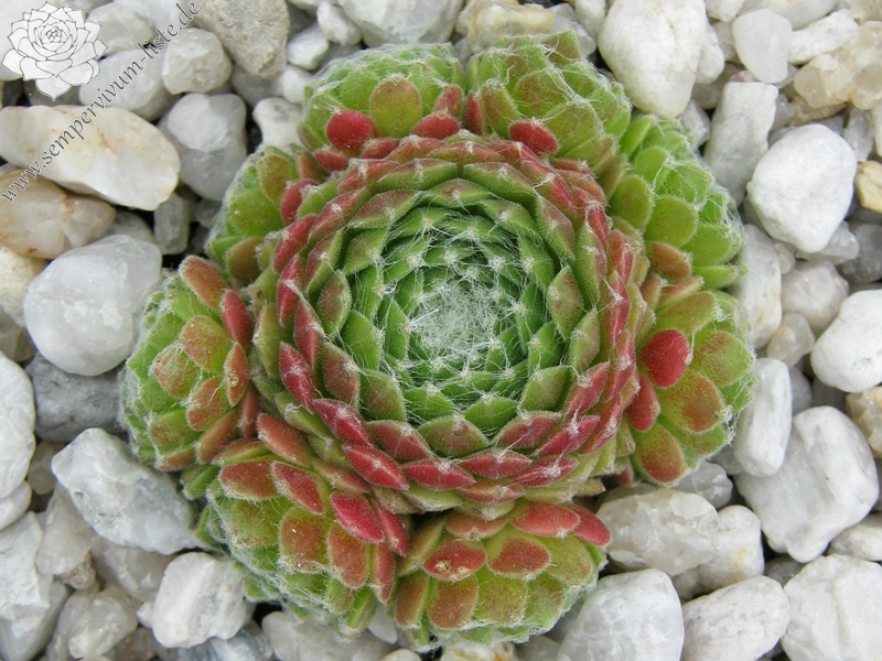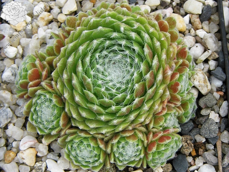 Kleine Rosetten, Blätter oval, kurz bespitzt, weissgrün, lachs überhaucht, stark besponnen.