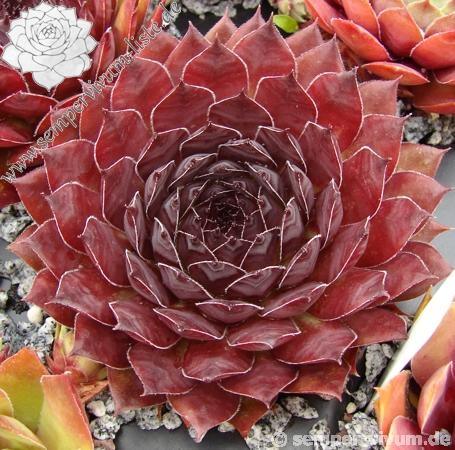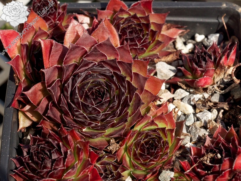 Die edlen Rosetten von Sempervivum 'Bitter Chocolate' erreichen einen Durchmesser von 9cm und sprossen gut. Die gleichmäßige, dunkelrote Grundfärbung wird von den hellen Blattböden schön abgerundet. Besonders im Frühjahr zeigen sich tolle Farben.