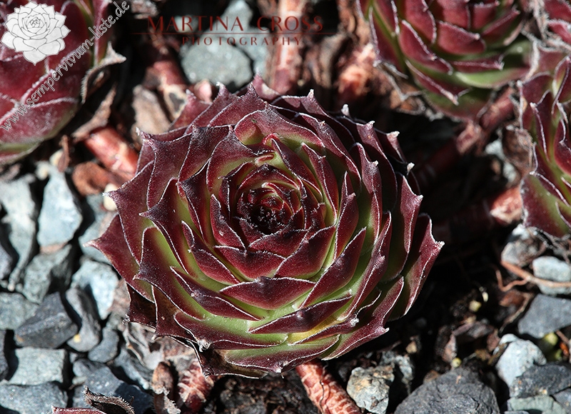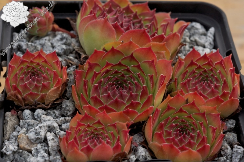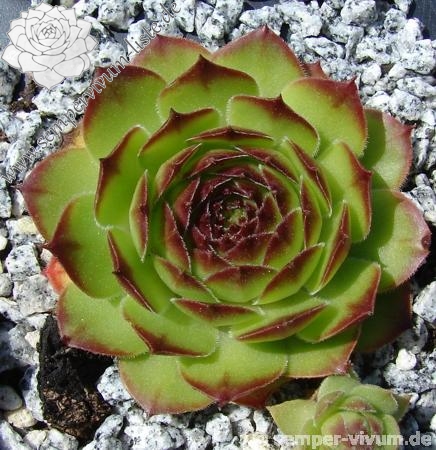 Eine neuere Züchtung mit etwas größeren Rosetten in brillanter Form. Die auffallend breiten und glänzenden Blätter sind während des Frühjahrs kontrastreich rotbraun bespitzt. Die Grundfärbung ist ein helles Grün das sich zum Herbst golden vermischt.