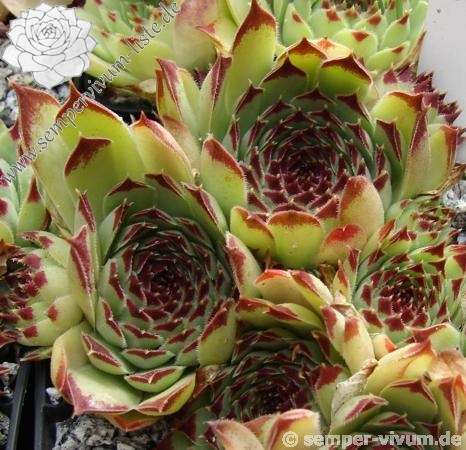 Erwin Geiger: Ein attraktiver Klon mit größeren Rosetten aus den französischen Seealpen. Die braunroten Spitzen sind sehr kontrastreich zur jadegrünen Grundfärbung der Blätter.