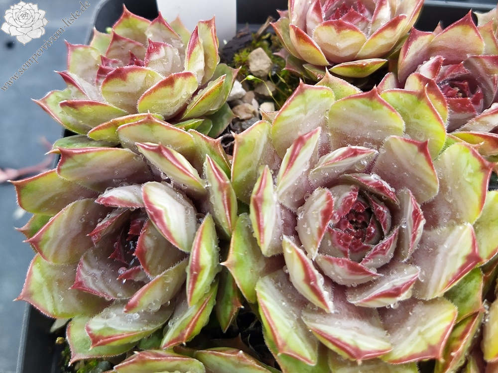 Mit Sempervivum 'Candy Kiss' haben wir eine ganz neue, kühl gefärbte Züchtung im Sortiment. Sie erreicht einen Durchmesser von 9 cm und sprosst willig. Die wohl geformten Rosetten zeigen sich sehr robust und haben mit hohen Temperaturen im Sommer keine Probleme. Im Frühjahr starten die Pflanzen dunkler gefärbt und werden mit steigenden Temperaturen immer heller. Besonders auffallend sind natürlich die orangen Blattenden in Verbindung mit den fast grauen Tönen im Zentrum. Bis jetzt zeigen sich nur selten Blüten, die gerne von Insekten besucht werden.