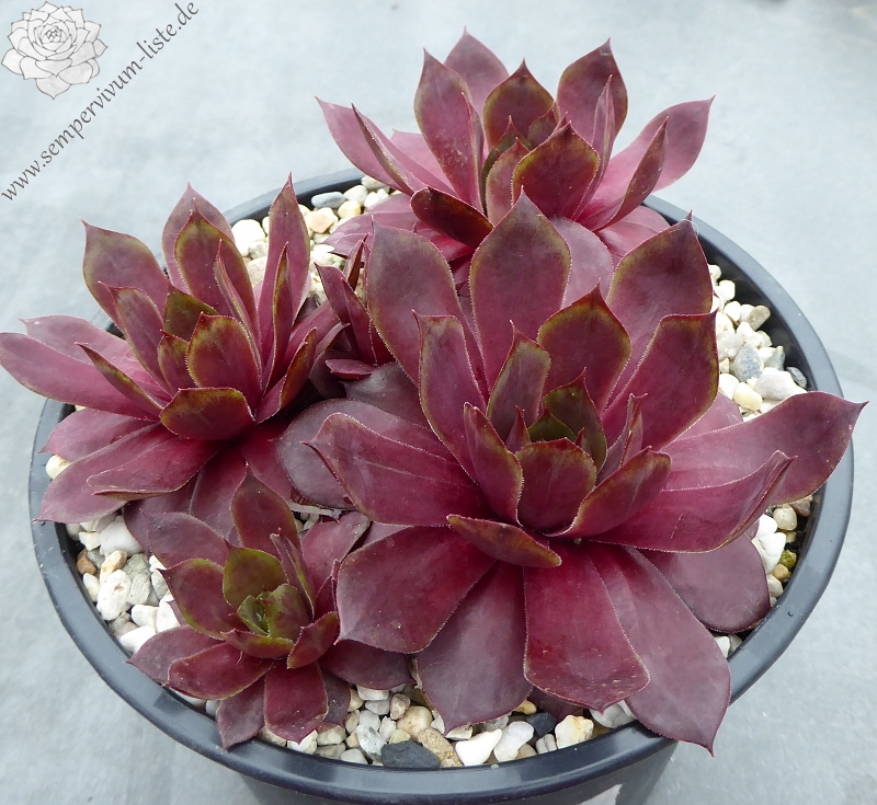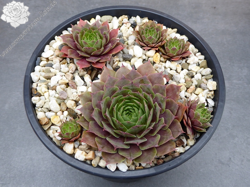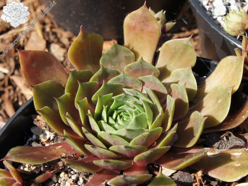 Sempervivum 'Chelli' ist eine große Züchtung, mit ganz besonderer Ausstrahlung. Die Pflanzen besitzen auffallend breite Blätter, die rötlich gefärbt sind. An den Blatträndern zeigt sich eine unregelmäßige hellgrüne Färbung. Eine pompöse Pflanze, die immer auffällt.
