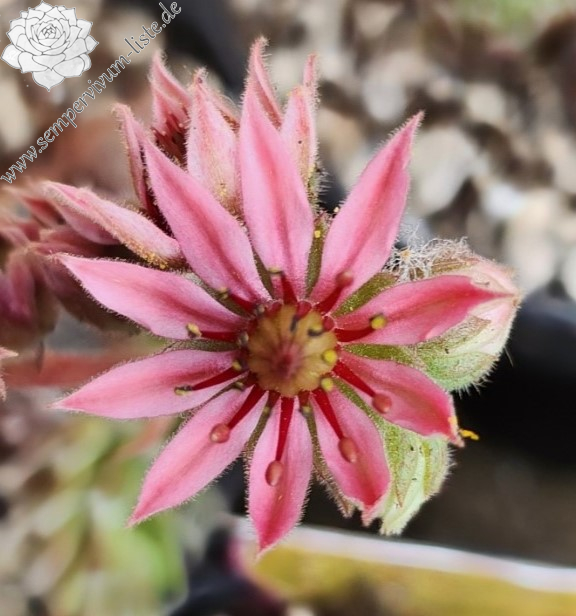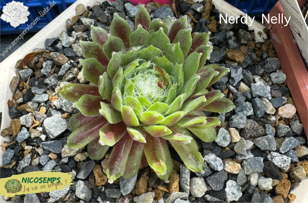 Sempervivum Chick Charmlettes 'Nerdy Nelly' ist eine Spinnweben-Sorte und hat je nach Jahreszeit Rosetten, die von grün bis violett reichen. Feines, weißes Gewebe bedeckt die Pflanze immer. PPAF