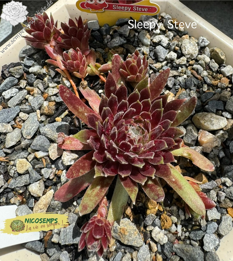 The Chick Charmlettes series of miniature Hen & Chicks are every bit as colorful, vigorous, and cold hardy as their larger flock members, just smaller! These little Chicks were selected to remain small and work great in tight places. Sempervivum Chick Charmlettes 'Sleepy Steve' forms deep red rosettes, with white webbing in the center. PPAF