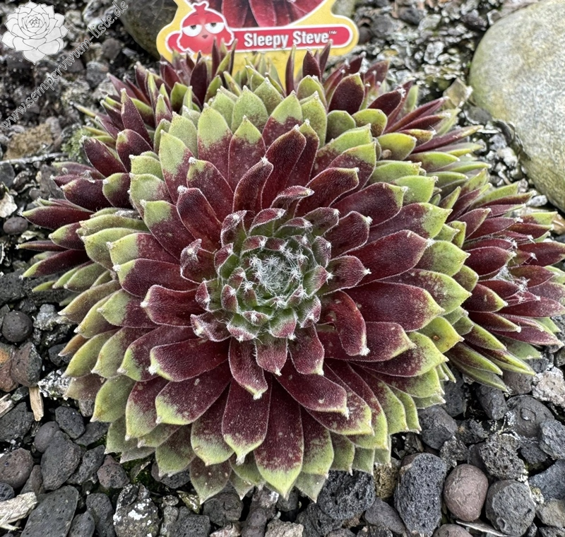 Sempervivum Chick Charmlettes „Sleepy Steve“ bildet tiefrote Rosetten mit weißem Geflecht in der Mitte. PPAF
