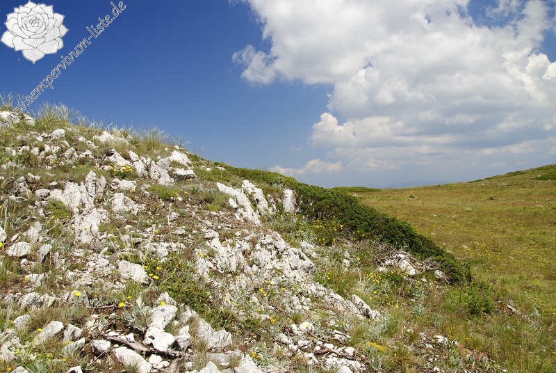 Lokalität: nordöstl. Abhang des Berges Magaro, am Rande einer kleinen Ebene, dort vor allem in den Felsspalten, an den Rändern der großen Steinen, in den Lücken unter den Steinen und im Gras in der Nähe der Steine