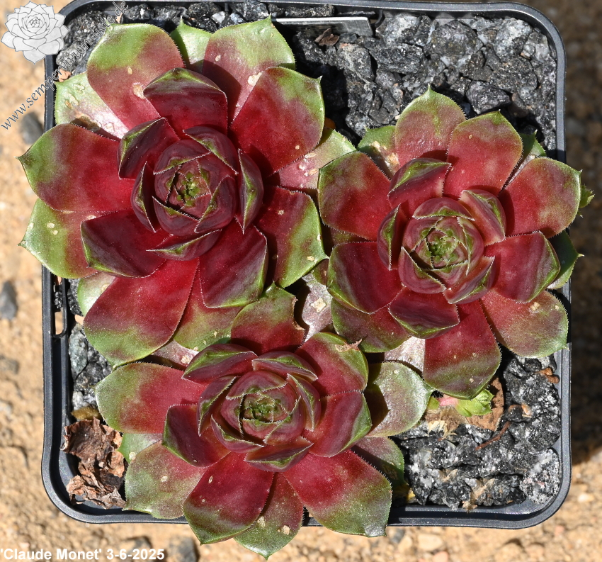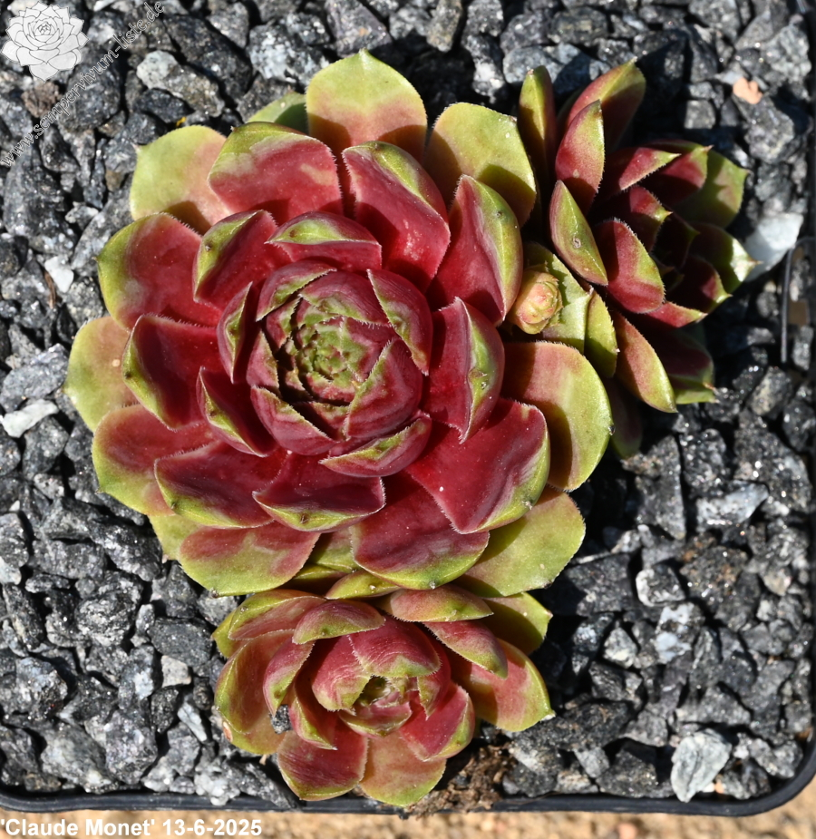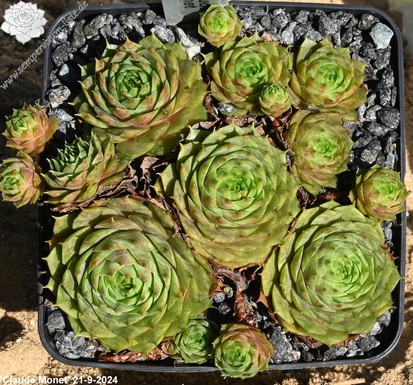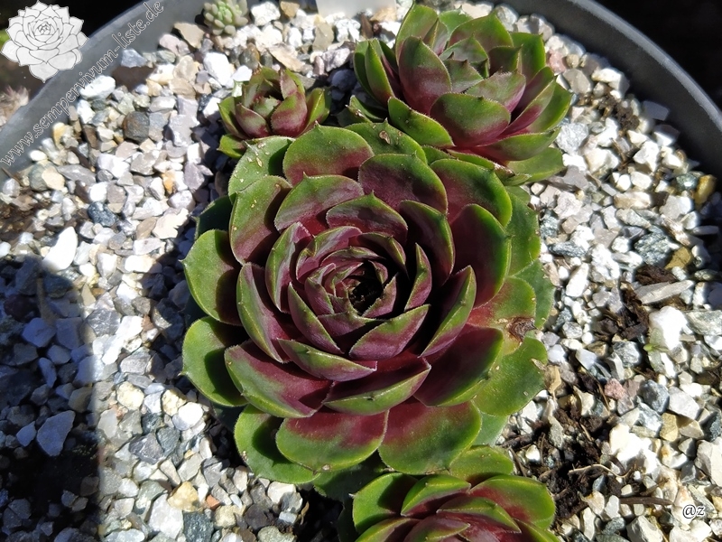 Das Aussehen erinnert an eine Mischung aus seinem Geschwistersämling 'Dampfnudelblues' und unserer beliebten Sempervivum des Jahres 'Picasso'. Die seerosenförmigen Rosetten sind auffallend breitblättrig, sukkulent und formen auch noch zahlreich Nachwuchs. Die Blattoberfläche glänzt im Frühjahr und wirkt dann wie mit Lack überzogen. Zu dieser Zeit erinnert der Anblick an wachsartige Substanz. Ein wüchsiger Sämling von 'Tarita'.