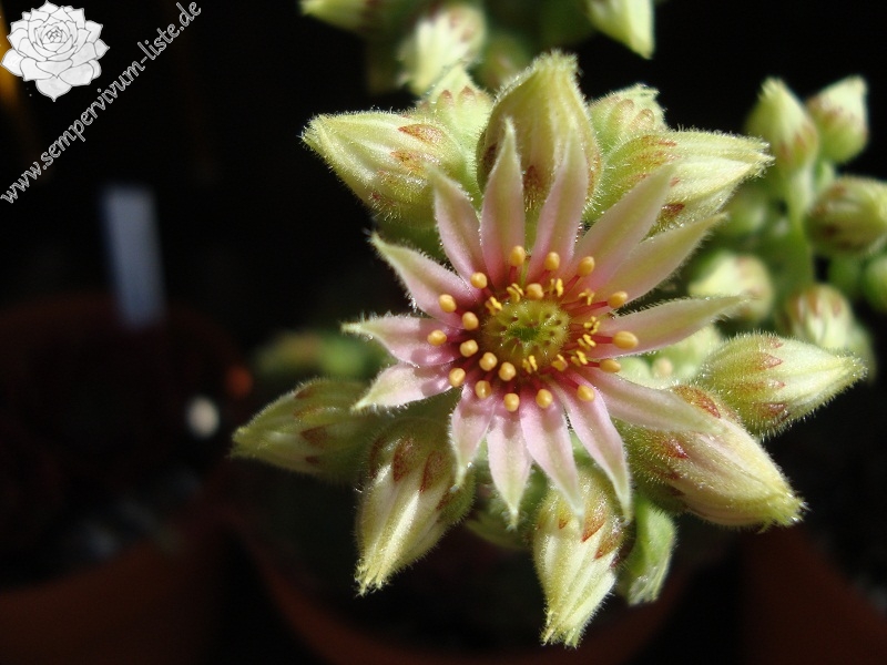 Rosetten bis 8 cm, helles rosiges Braun, innen grün, samtig bis plüschartige Oberflächenstruktur, Blüte bis 27 cm, blaßrosa, innen karmin