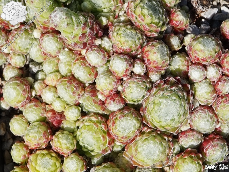 Eine schöne kleine Spinnwebhauswurz. Das Besondere sind die dichten Polster. Die Rosetten stehen so eng zusammen, dass sie sich gegenseitig in die Höhe schieben und so interessante hügelige Polster bilden!