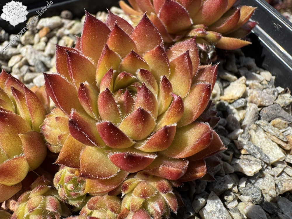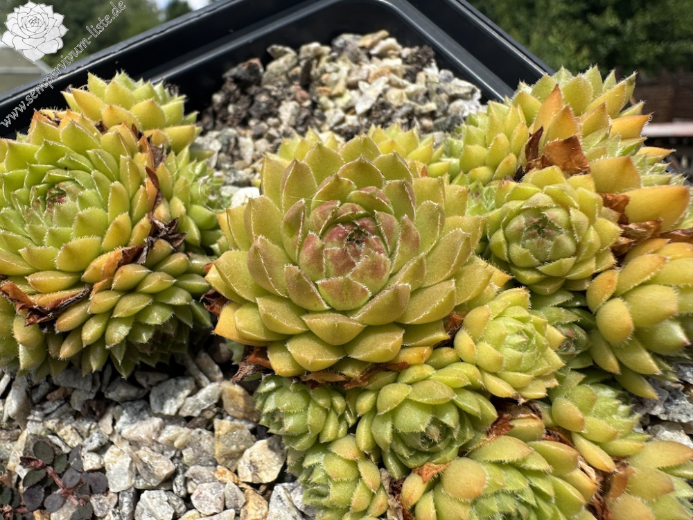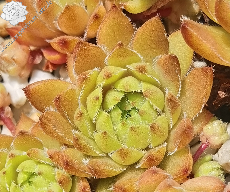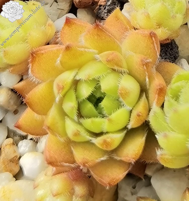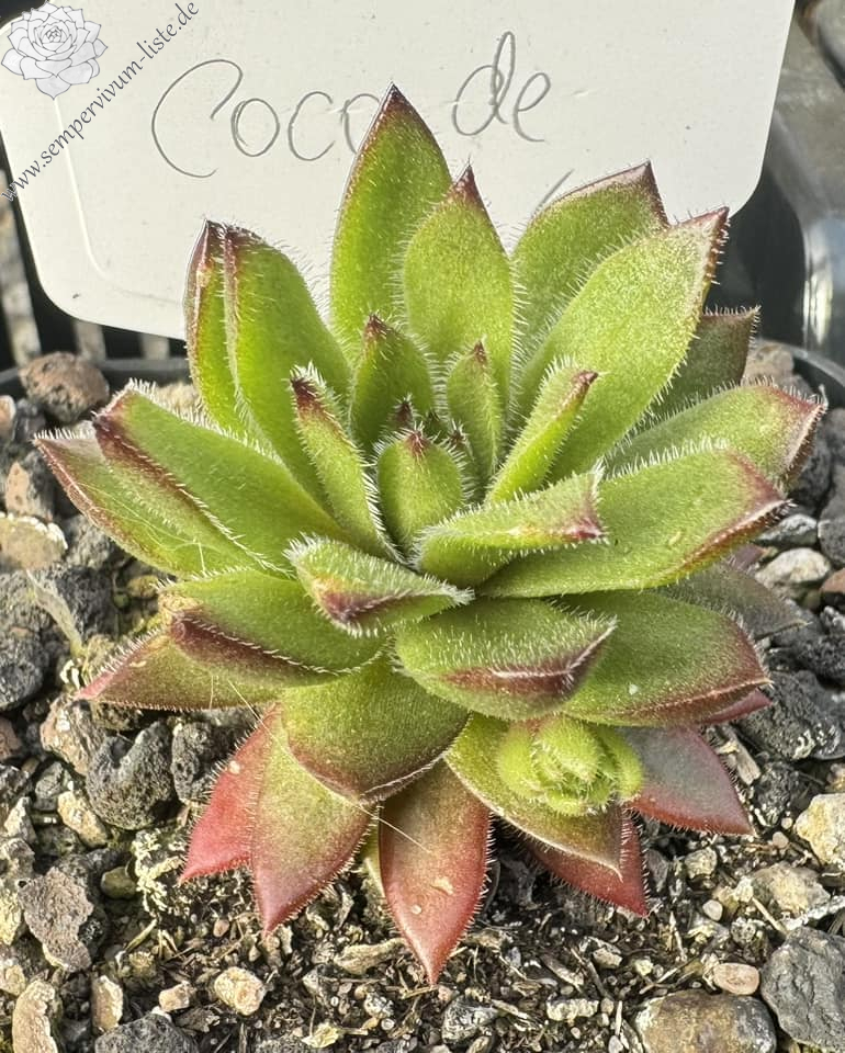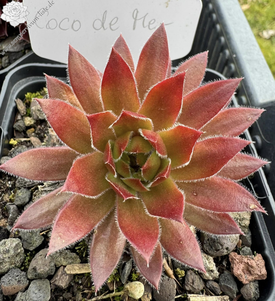 'Coco de Mer' kommt bronzefarben aus dem Winter. Im Juni zeigt sie, wie die meisten Sorten, ihre schönsten Farben. Die äußeren Blätter trägt sie abgespreizt, an der Basis hellgelb, zu den Blattspitzen werden sie dunkler und sind schön orangefarben. Die Spitze ist etwas dunkler und endet in einem noch dunkleren Punkt. Die Blattränder tragen lange Wimpern, das Herz ist fest geschlossen, mit hellgrünen Blättern. Die jüngsten Ableger der ca. 5 cm großen Rosetten sind hellgrün.