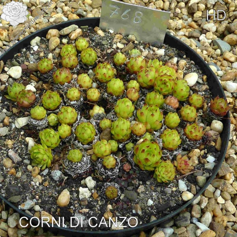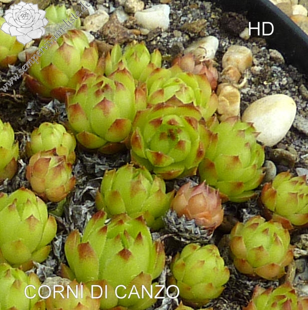 Hier haben wir eine frischgrüne Naturhybride, die erstmals von Henri Correvon erwähnt wurde. Vielleicht wurde sie nach ihrem Fundort benannt, dem "Corni di Canzo", einem Berg in Italien. Sie zeigt sich als sehr wüchsig und soll eine Kreuzung von Sempervivum tectorum x Sempervivum wulfenii sein.