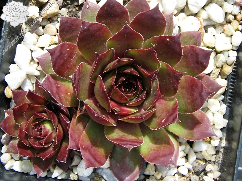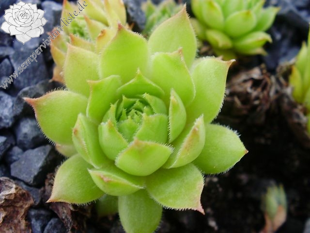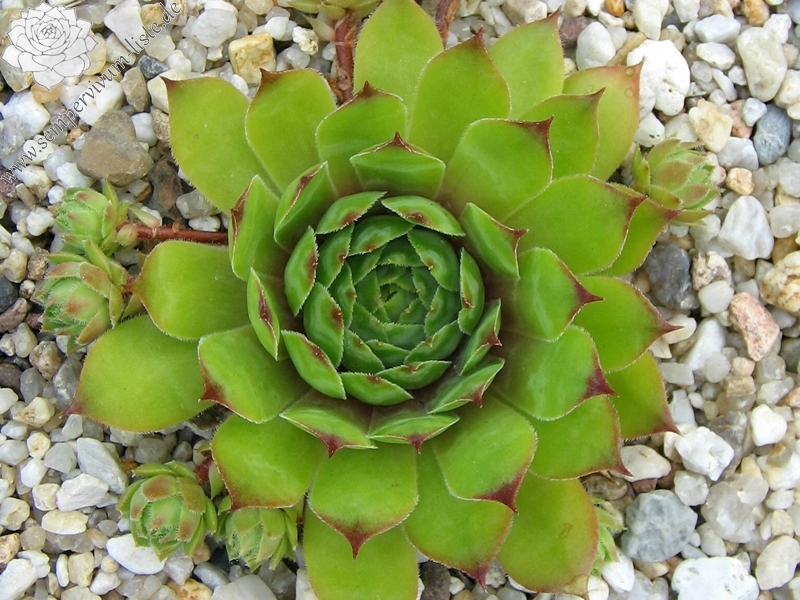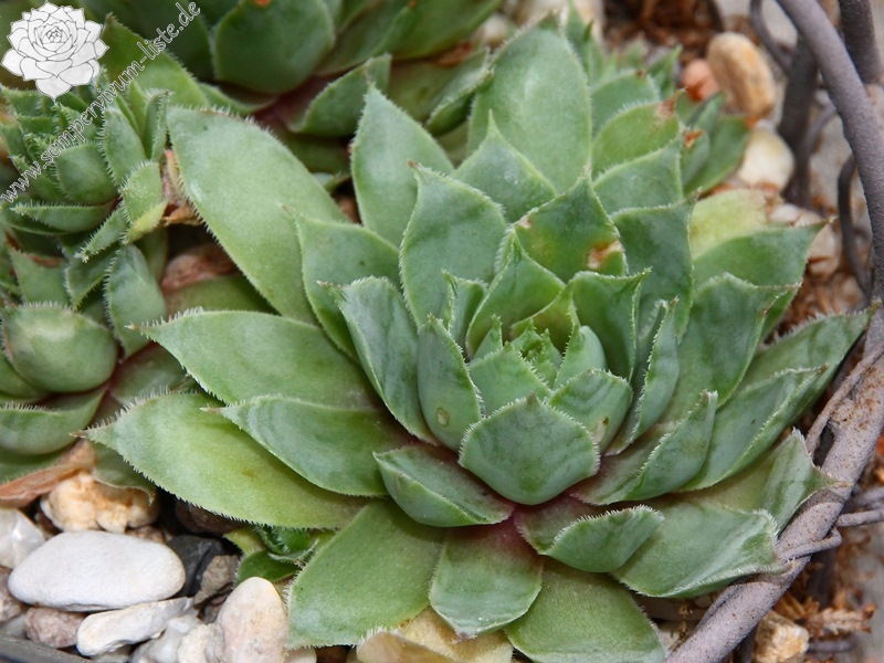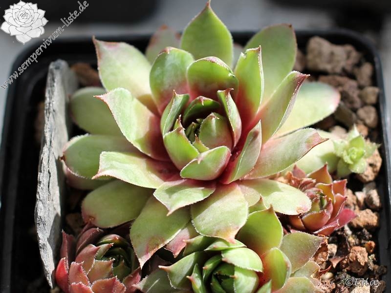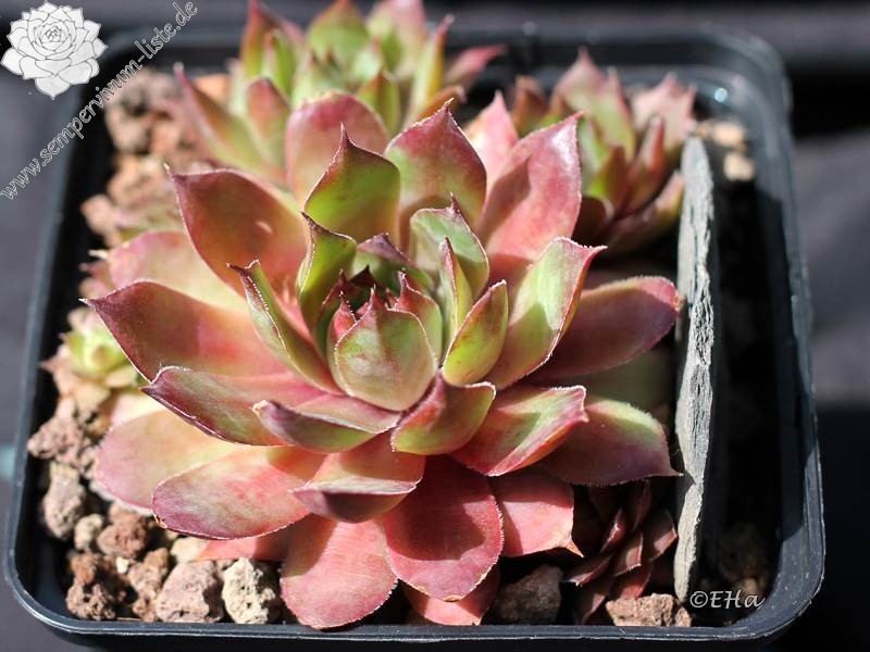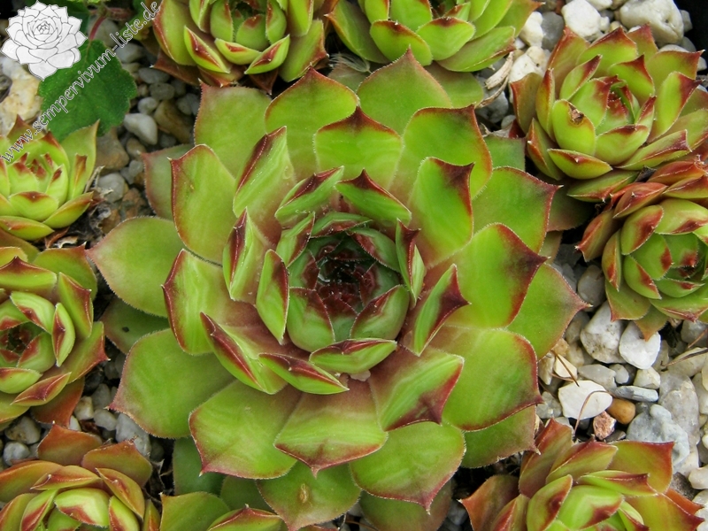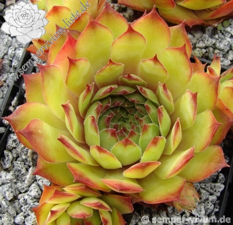 Eine deutsche Sorte mit relativ spitzen Blättern, die große Rosetten formen. Die schönste Färbung zeigt 'Cripello' im Juni: Gelblichgrün mit orangeroten Blattspitzen.