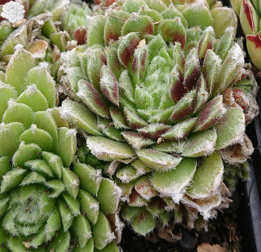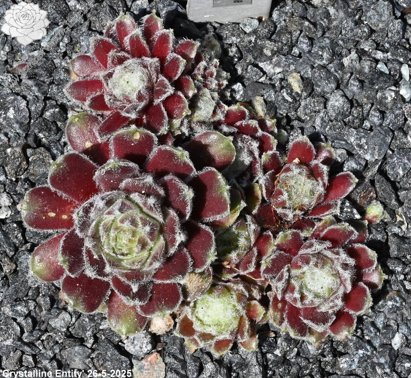 Sempervivum 'Crystalline Entity' fällt besonders durch die weiße Behaarung auf. Die mittelgroßen Rosetten bilden dichte Polster. Eine wüchsige Pflanze.