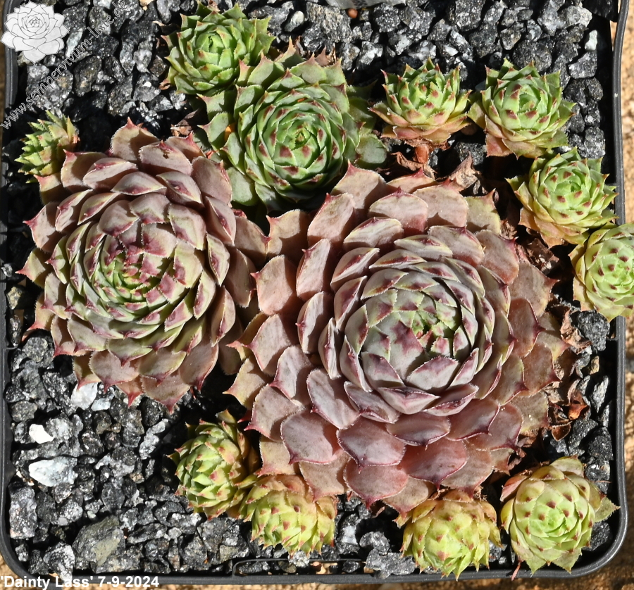 Mit 'Dainty Lass' haben wir ebenfalls eine wüchsige Sempervivum, mit besonderem Charme. Besonders gut gefallen mir die leuchtend roten Blattspitzen, die sich deutlich abheben. Die mittelgroßen Rosetten sprossen gut. Deutlich ist das Sempervivum calcareum Blut zu erkennen!