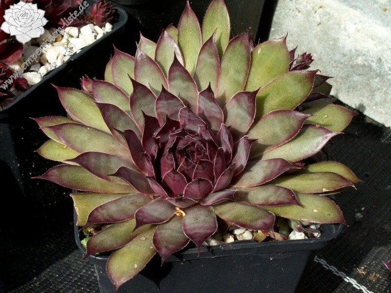 Eine beliebte englische Hybride mit hellolivgrünen Rosetten mit dunklen mahagoniroten bis schwarzpurpurnen Spitzen.