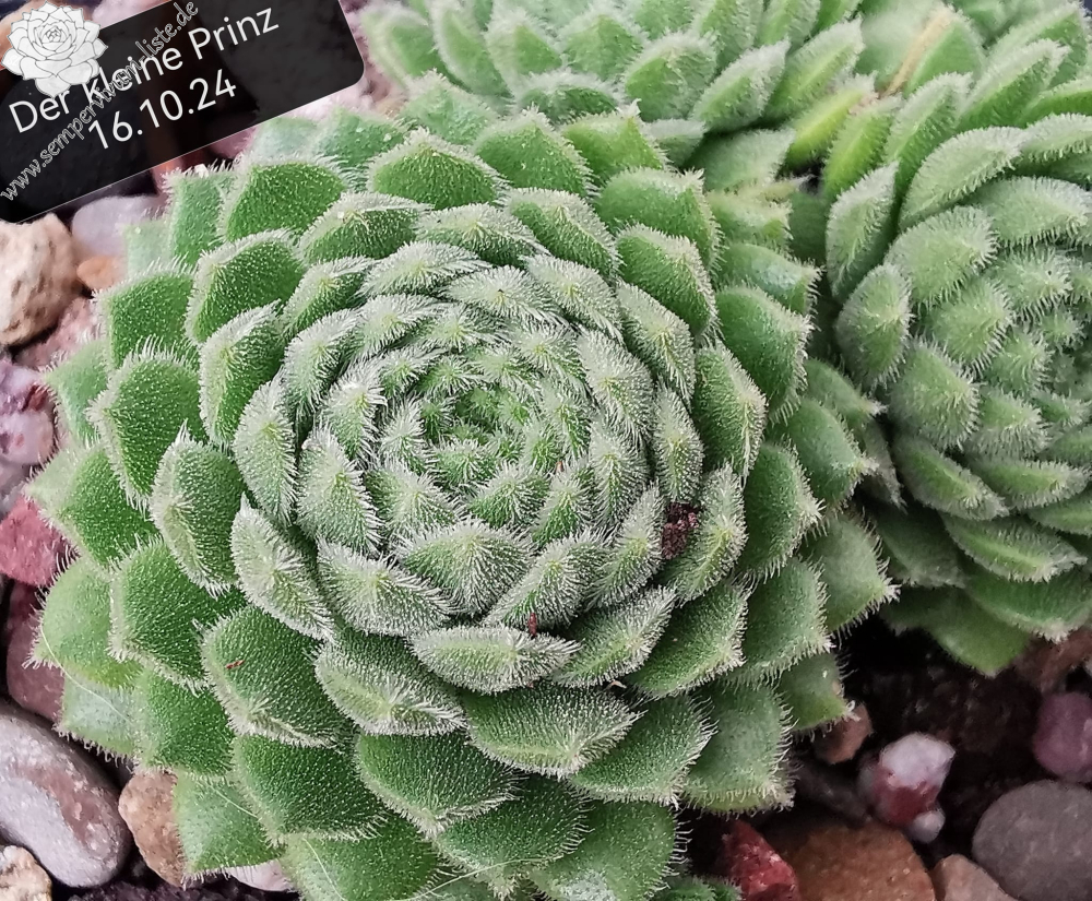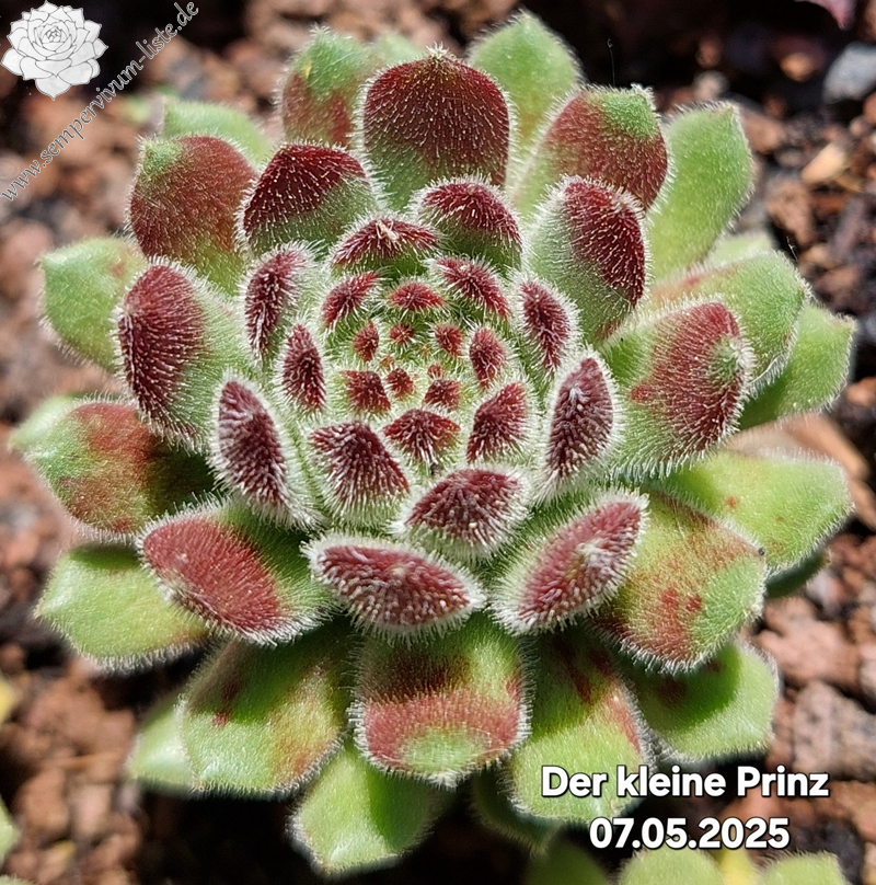 Eine kleinere Pflanze mit viel S. grandiflorum-Blut. Hellgrüne, sehr feste, spitze und leicht klebrige Blätter mit harzigem Geruch, wie die Mutterpflanze. Die einzelnen Blätter sind dicht behaart und silbrig glänzend. Die Rosetten werden ca. 4 - 5 cm groß. Man kann den Blätterwirbel gut erkennen, der in der Mitte in einem kleinen Strudel/Trichter endet.