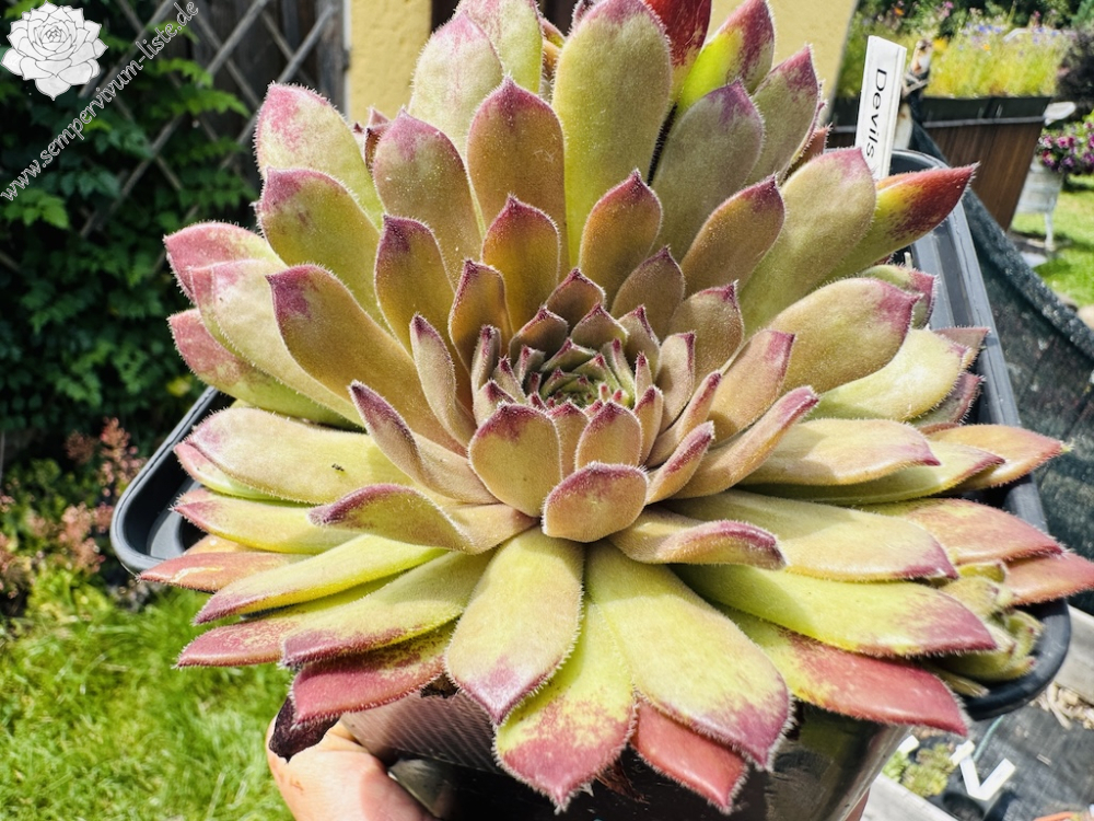 Im Juni verwandet sich die Farbe der äußeren, samtigen Blätter in ein tiefes Rot. Die mittleren Blattreihen strahlen in hellem beige und die Spitzen werden ebenfalls tiefrot. Im Sonnenlicht scheinen die Blätter goldgelb. Das helle Rosettenherz ist fest geschlossen und die Blättchen zeigen einen roten Dorn.