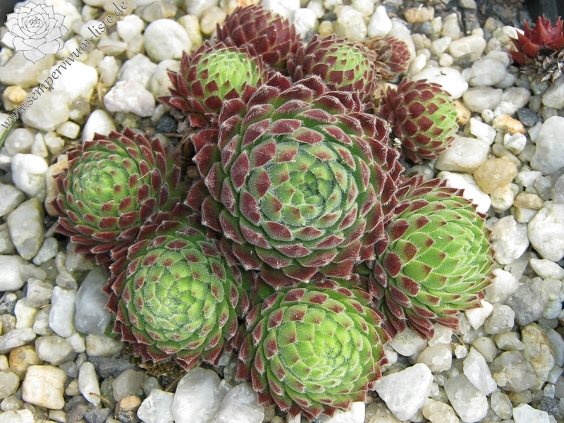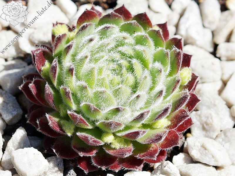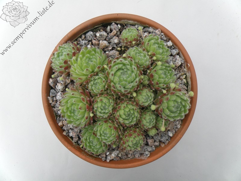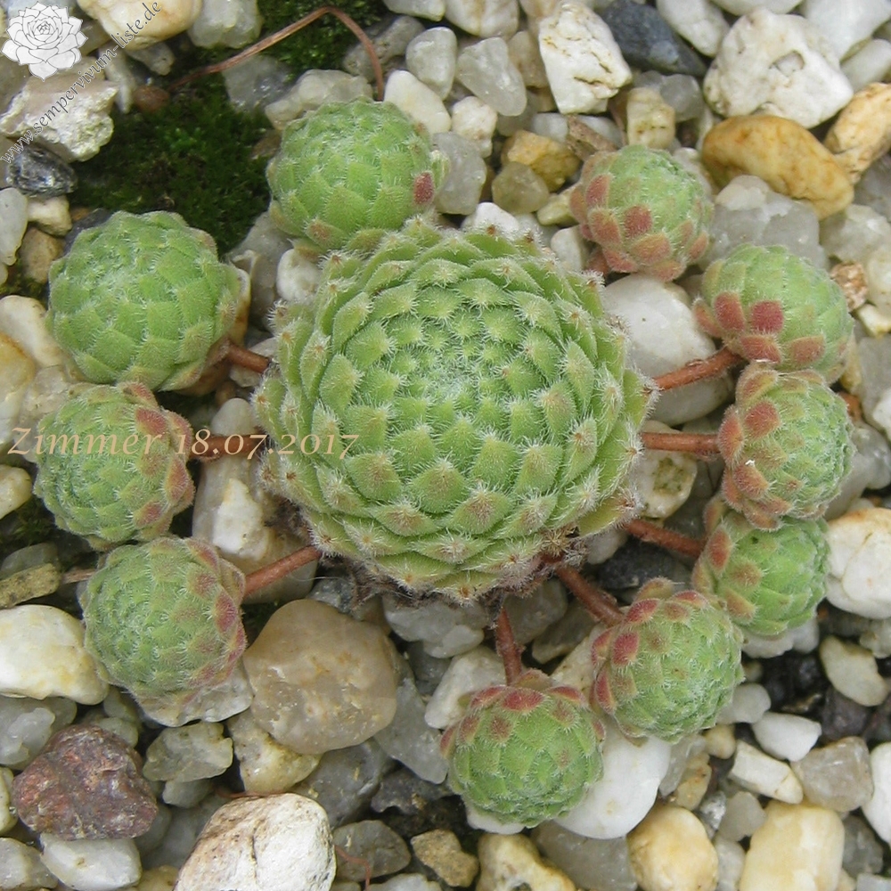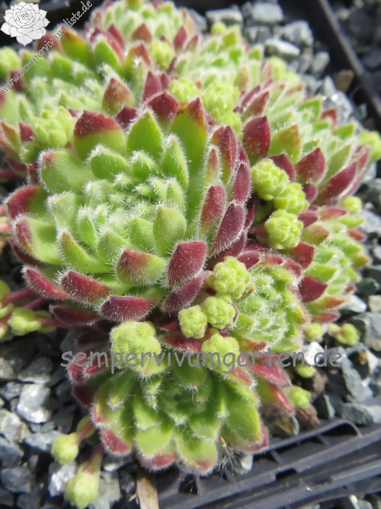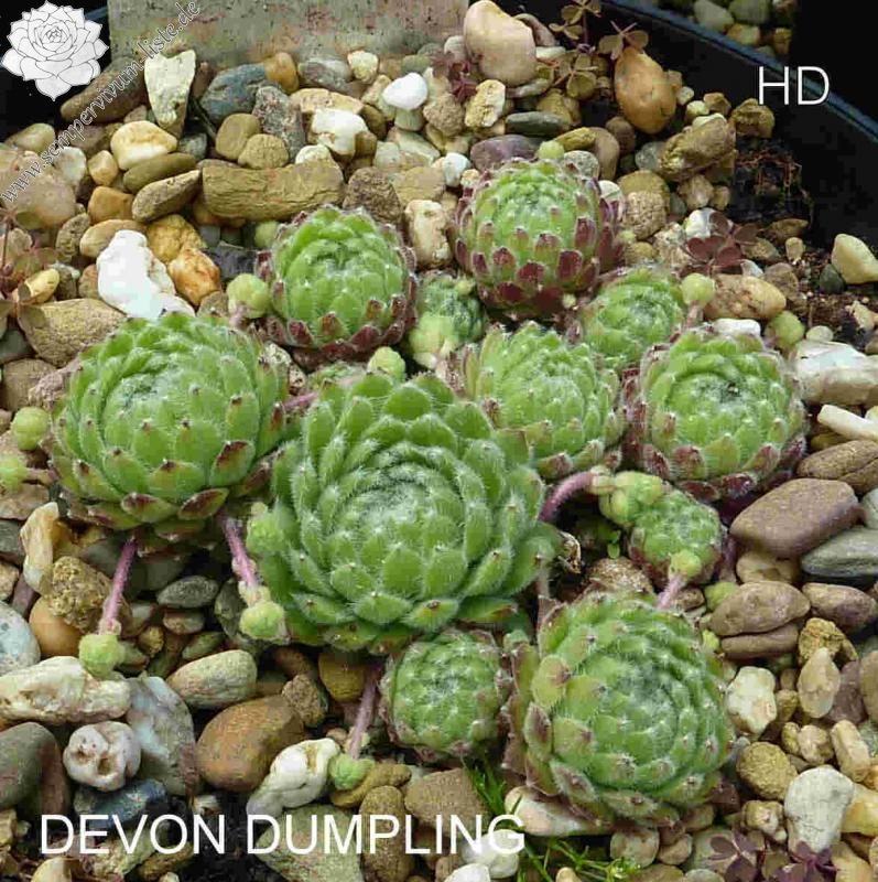 Sempervivum 'Devon Dumpling' ist ein kleiner, süßer Hauswurz. Die Rosetten sprossen willig und besitzen eine leichte, weiße Behaarung. Schön sind die dunkelrot gefärbten Blattspitzen. Ein Liebling vieler Gartenbesucher!