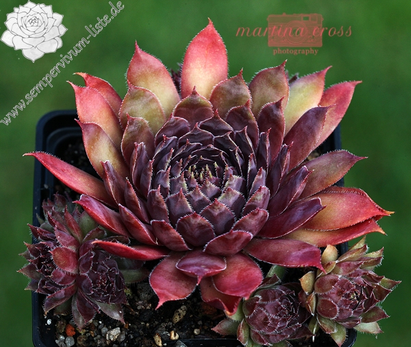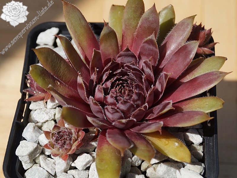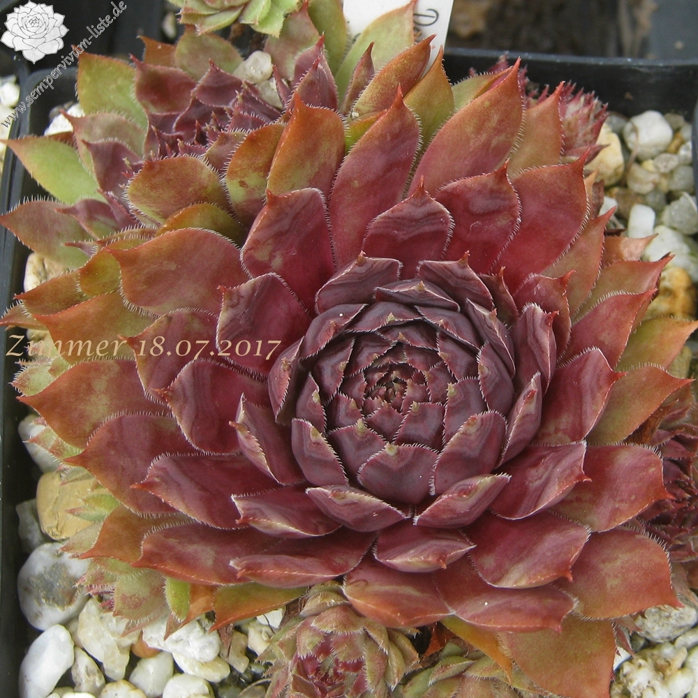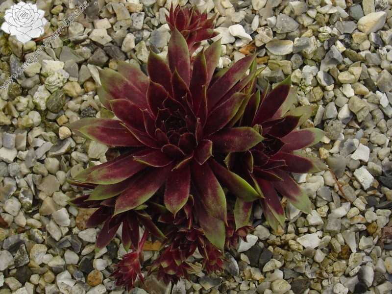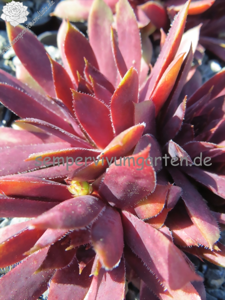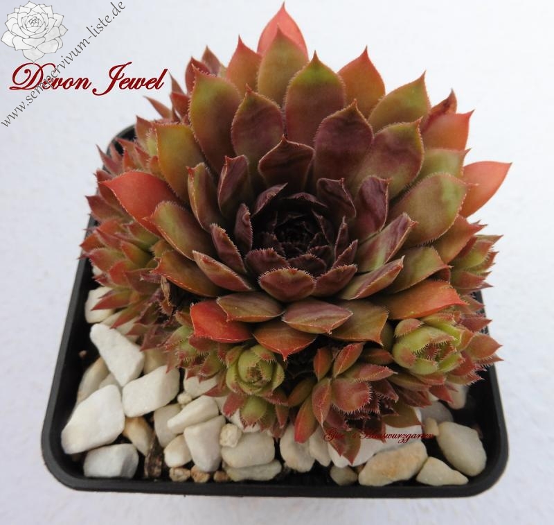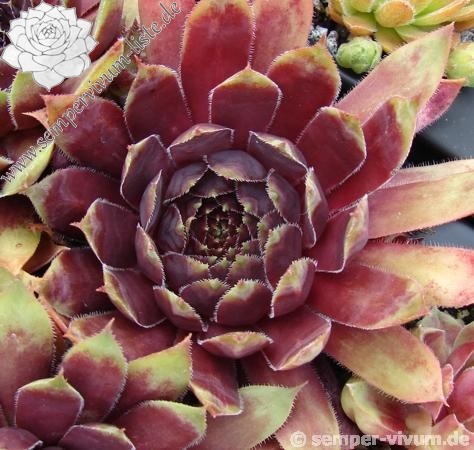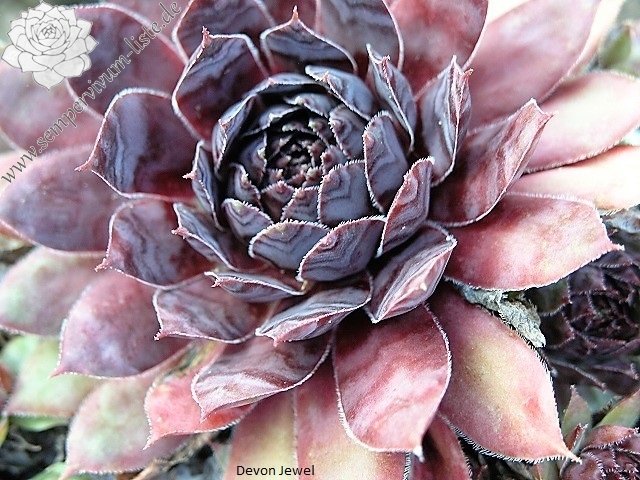 Eine dunkle Neuheit aus Großbritannien. 'Devon Jewel' formt mittelgroße Rosetten mit dunkelvioletten und rosafarbenen Tönen. Die Blattspitzen wurden in helles Ocker getaucht, die Ränder sind silbrig weiß bewimpert.