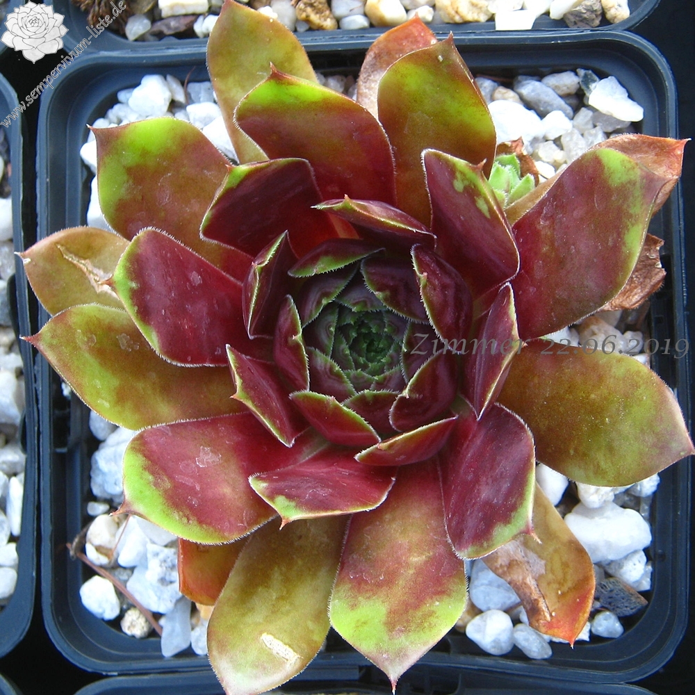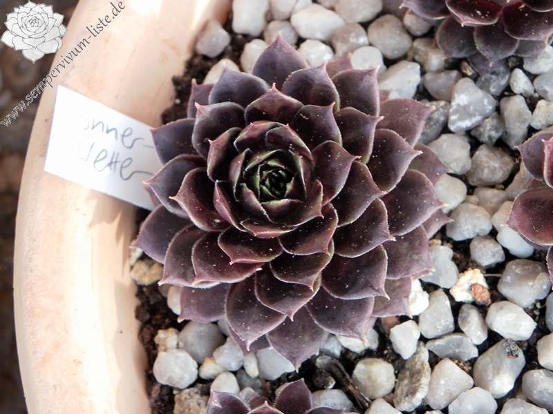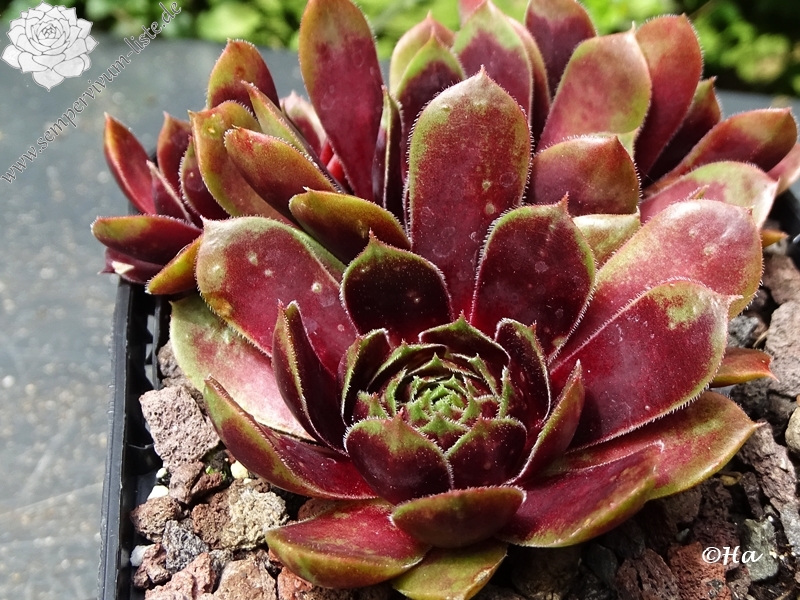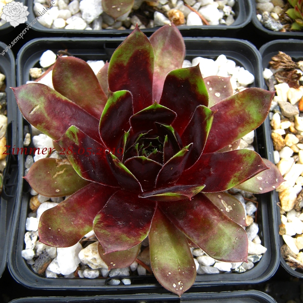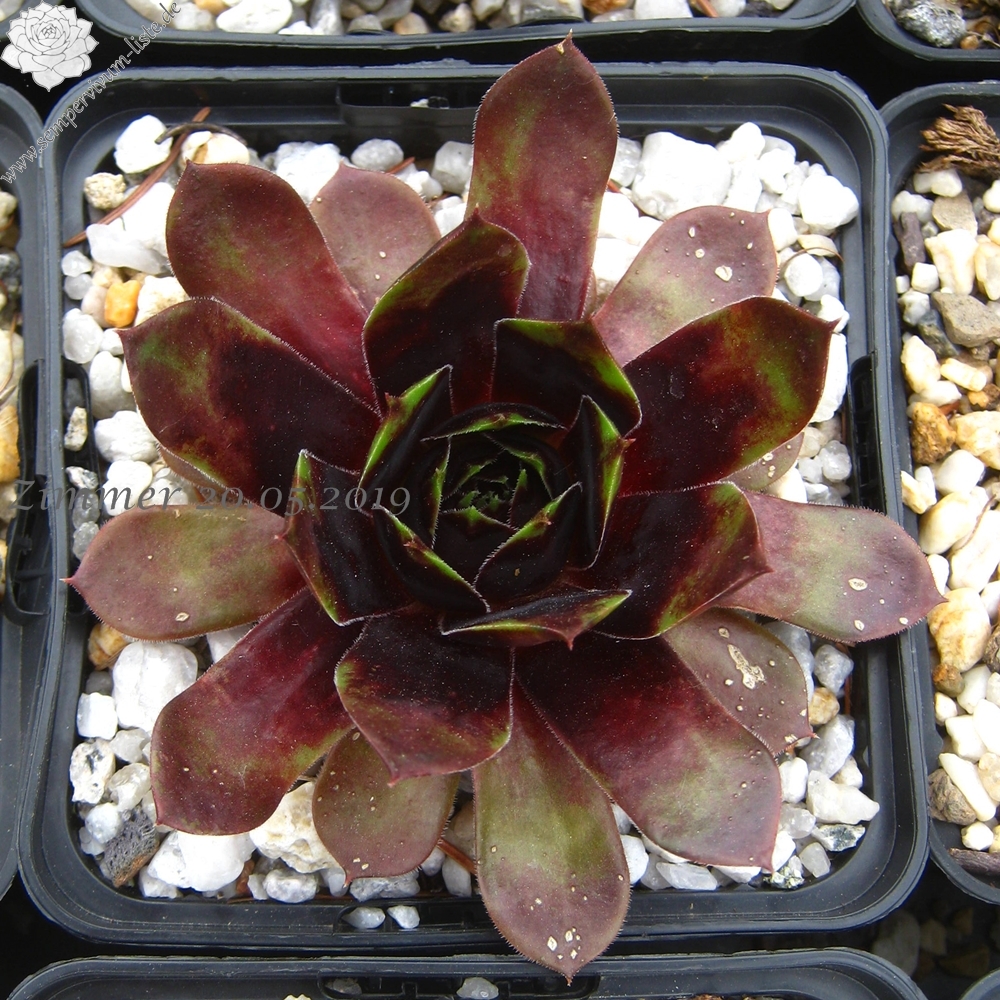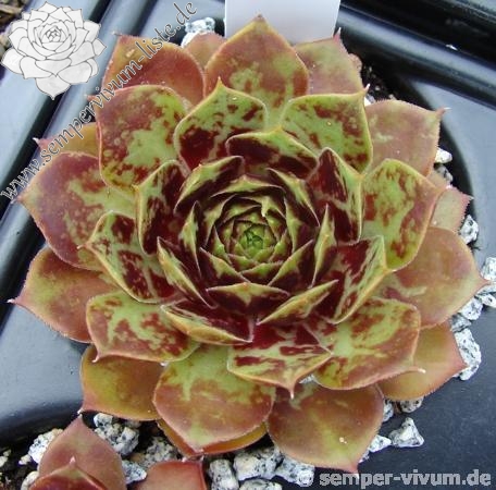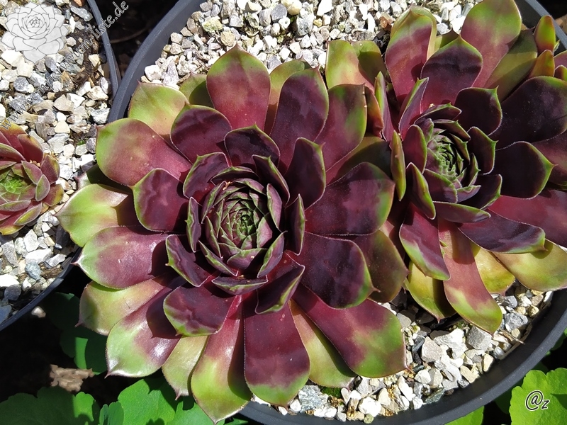 Diesen Geschwistersämlig von 'Picasso' vermehren wir nun schon seit über zehn Jahren: Er formt größere Rosetten mit einem Durchmesser von etwa 10 bis 12 cm und zeigt ganzjährig viele Gesichter. Die nahezu schwarze Frühjahrsfärbung wurde unserer Auslese von der Mutter 'Innocentia' weiter vererbt. Besonders auffallend ist bereits ab Mitte April die glänzende Blattoberfläche, die wie lackiert wirkt. Ende Mai erscheinen zahlreiche Flecken auf dem Laub, wodurch bis Juli ein sensationeller Anblick entsteht.