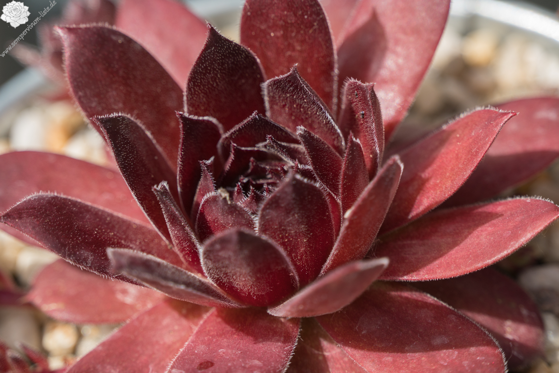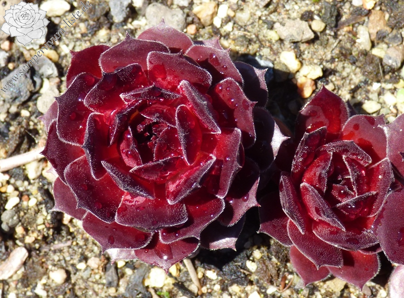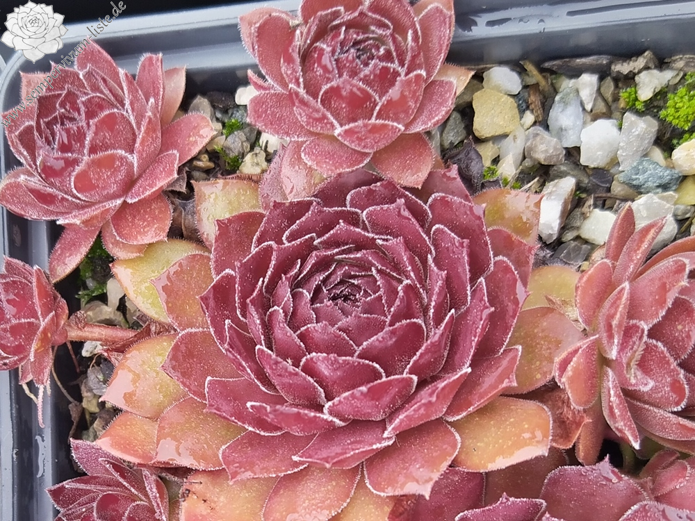 Es gibt in der Tat schon Züchtungen, die bis zum Sommeranfang dieser Auslese auffallende Ähnlichkeiten aufweisen. Doch ab Mitte Juni wirken die Blätter der ca. 8 cm großen Rosetten leicht gewellt, ja irgendwie verdreht, was insgesamt zu einer brillanten Form führt. Durch die samtene Textur der Blätter wirkt sie noch edler im Herbst. Dazu diese burgunderrote Farbe, herrlich! Sie stammt aus Sämlingen von S. transcaucasicum ex SEWAN Island PH931 und hat somit Verwandte aus armenischer Abstammung.