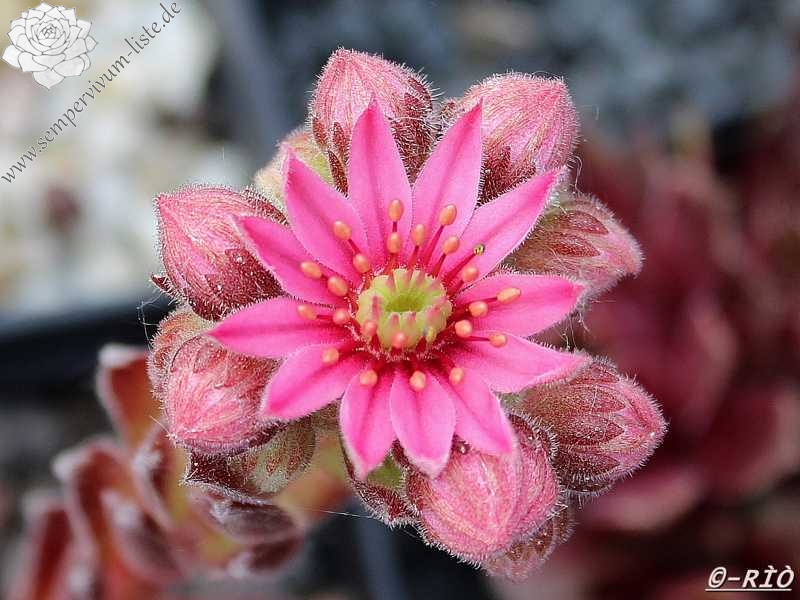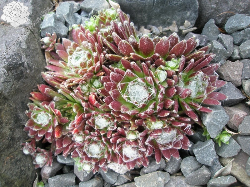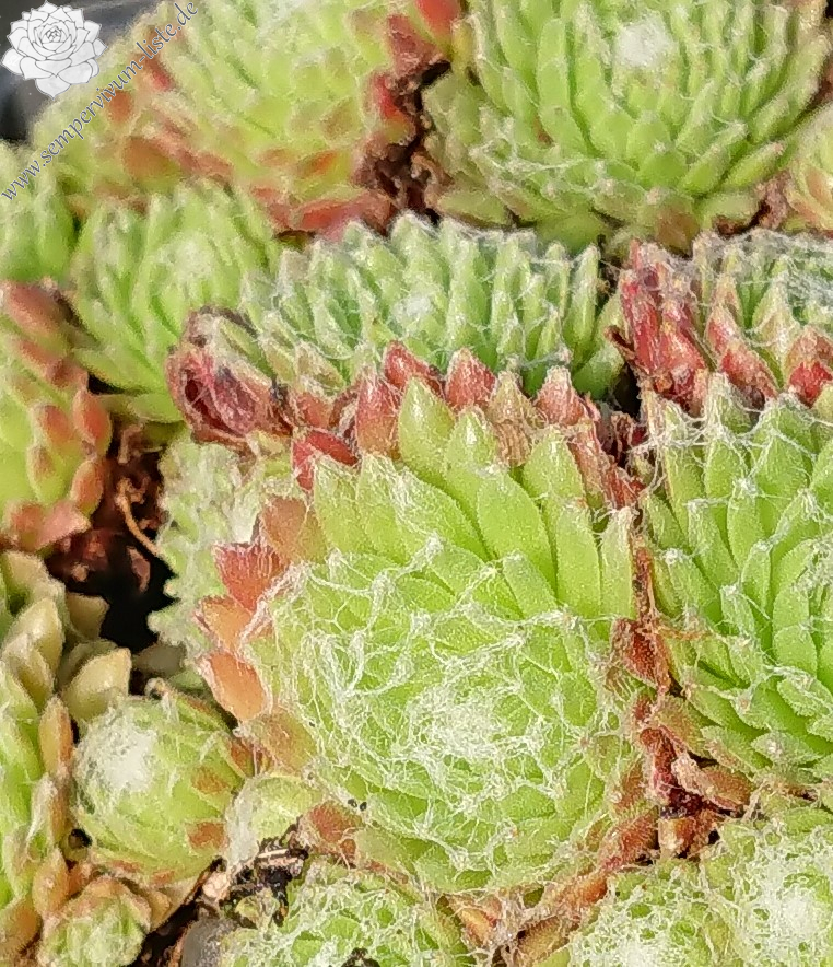 Ein besonders schöner Spinnwebhauswurz mit dicht besponnenen Rosettenzentrum. Besonders im Frühjahr, wegen den rötlichen Rosettenrändern auffallend!