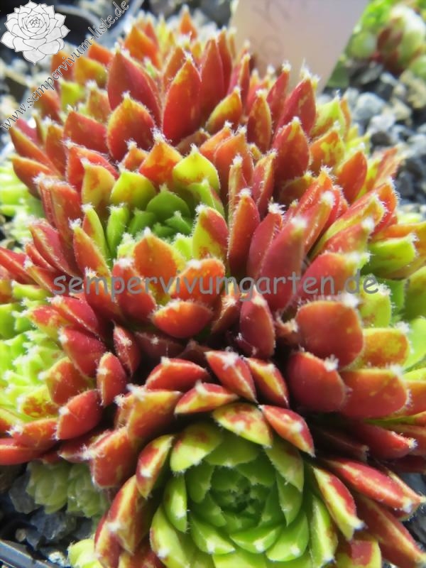 Eine mittelgroße Züchtung die gut sprosst und ganz dichte Polster bildet. An den Blattenden zeigt sich weiße Behaarung.