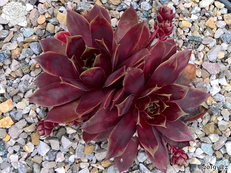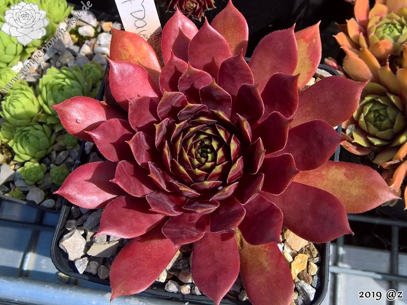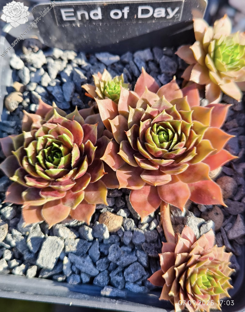 Sempervivum 'End of Day' ist ein größerer Sämling von der bekannten Sorte 'Romiley'. Die offenen Rosetten erreichen einen Durchmesser von über 9 cm und besitzen breite Blätter. Die Färbung wechselt je nach Jahreszeit auffallend und präsentiert immer kräftige Farben, die sich auch bei höheren Temperaturen sehr gut halten. Die verschiedenen Rottöne erzeugen ein harmonisches Bild, dass durch die hellen Blatträndern abgerundet wird. Besonders im Zentrum fallen die hell gefärbten Ränder deutlich auf und erzeugen fast ein grünes Herz. Im Sommer färben sich die äußeren Blätter heller und verleihen der Pflanze eine sehr bunte Wirkung. Es handelt sich um robuste Pflanzen, die gut und willig sprossen.