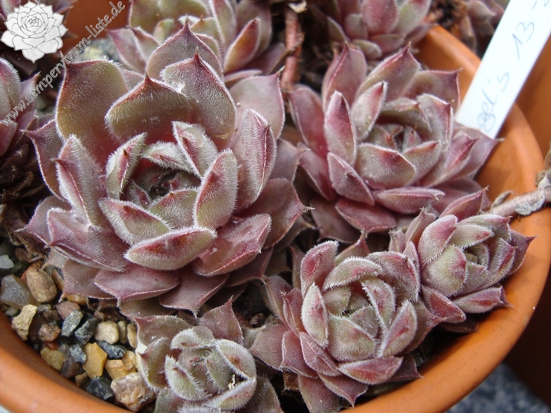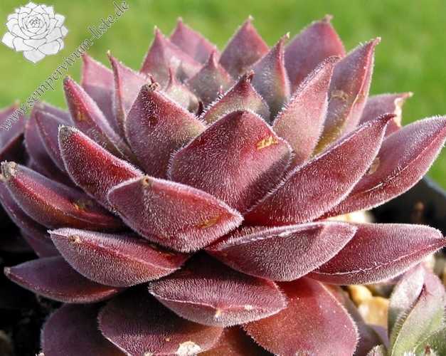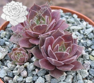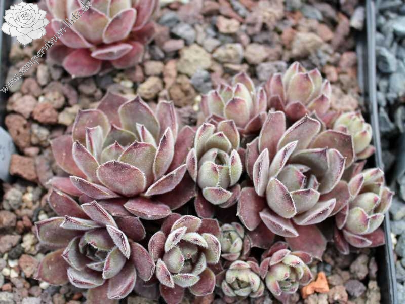 Velvety grey down overlays the plum-coloured leaves giving a very pleasant effect. Like most houseleeks, the colours change with the seasons, this one darker and more purple in winter, greyer and more downy in summer. Forms clumps of nicely symmetrical rosettes. Very effective in a group. One of our long-time favourites.