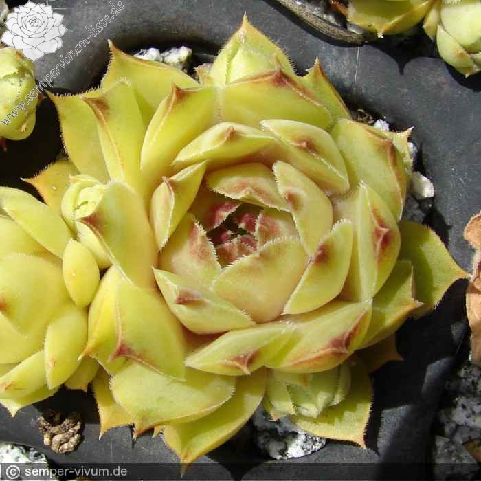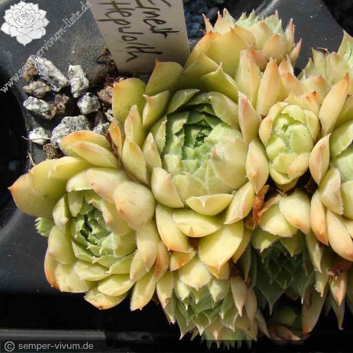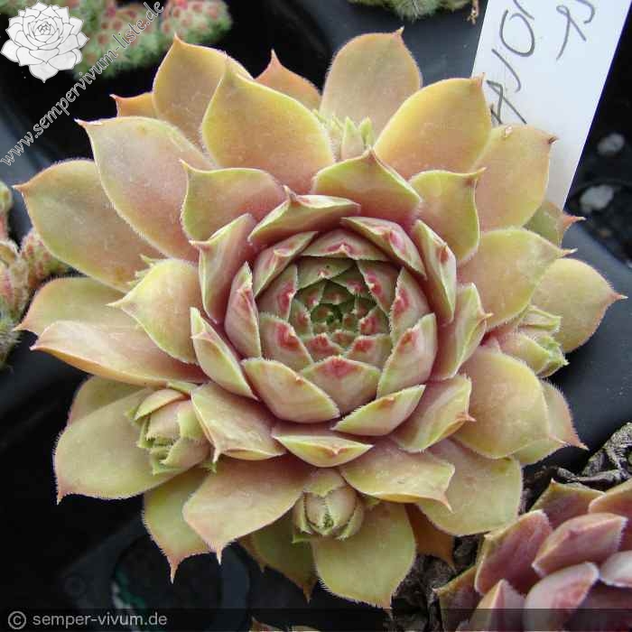 Ein kompakt wachsender Sämling aus Großbritannien, der nach dem Züchter benannt wurde: Kleinere Rosetten formen innerhalb kürzerer Zeit hübsche Polster. Die Blätter sind zum Frühjahr in olivfarbenem Pastell mit Rosa gemischt. Ab Juni mit gelblicher Mixtur, die sich dann durch die Sommersonne mit Jadegrün vermischt.