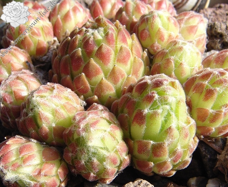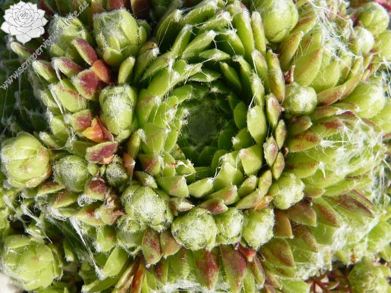 Rosetten 1-1,5 cm, kugelig, gelbgrün, außen rosa, Spinnweben