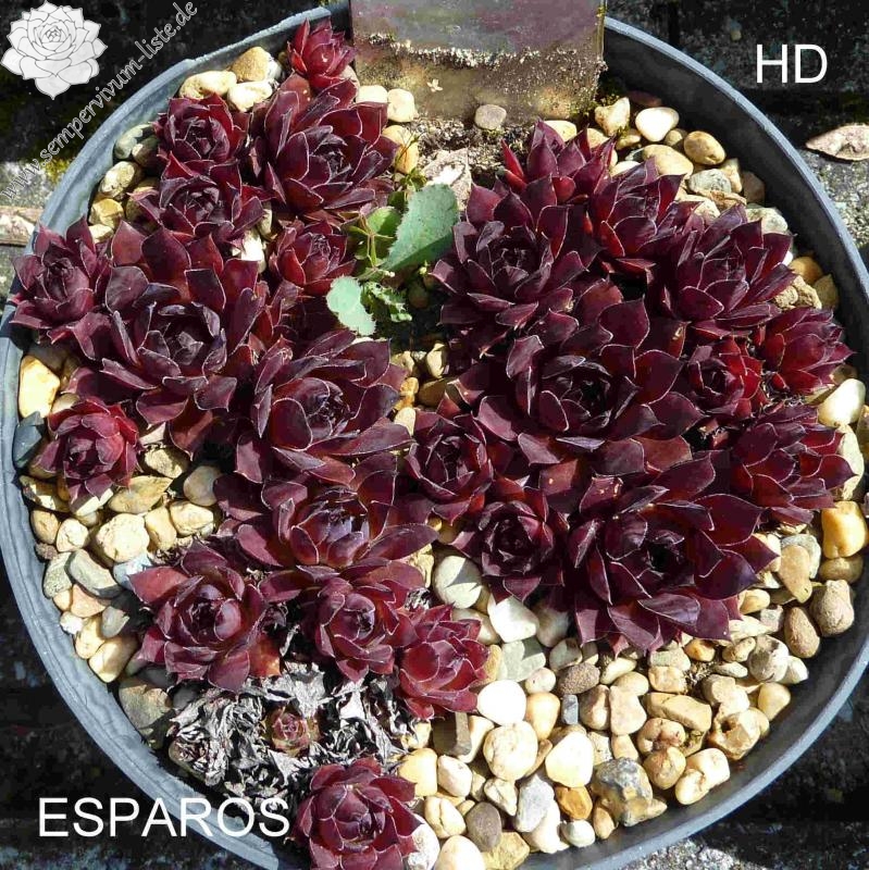 Sempervivum 'Esparos' ist eine mittelgroße Züchtung die gut sprosst. Die kräftigen, etwas bullig wirkenden Rosetten bilden dichte Polster. Die Blätter sind rötlich gefärbt und besitzen einen hellen Blattboden. Die Pflanzen haben eine ganz tolle Ausstrahlung