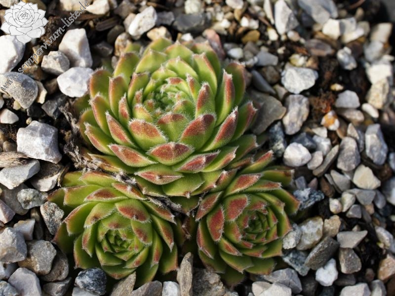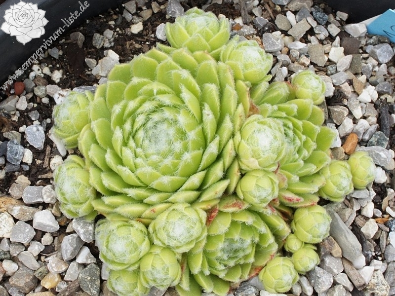 Eine belgische Spinnwebhauswurz mit auffallend heller Färbung. Die Spitzen sind während der lichtreichen Monate mit kleinen, weißen Wattebäuschen versehen. Die Rosetten sind schon etwas größer, als bei den meisten S. arachnoideum Hybriden.