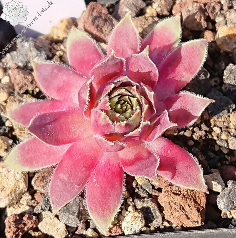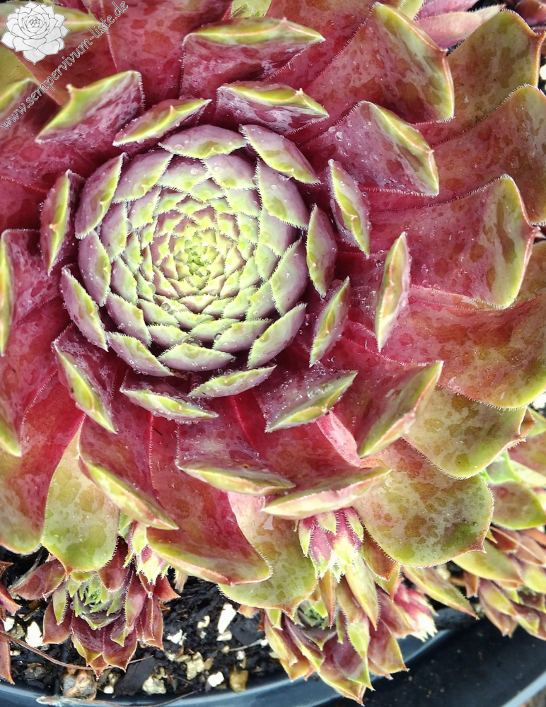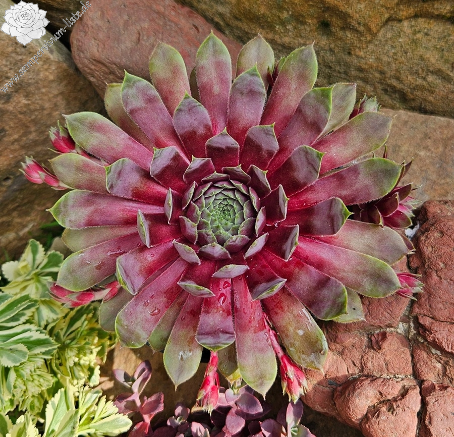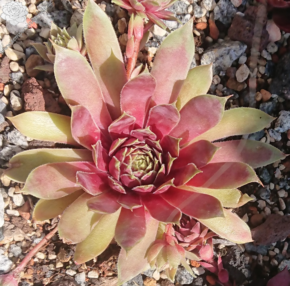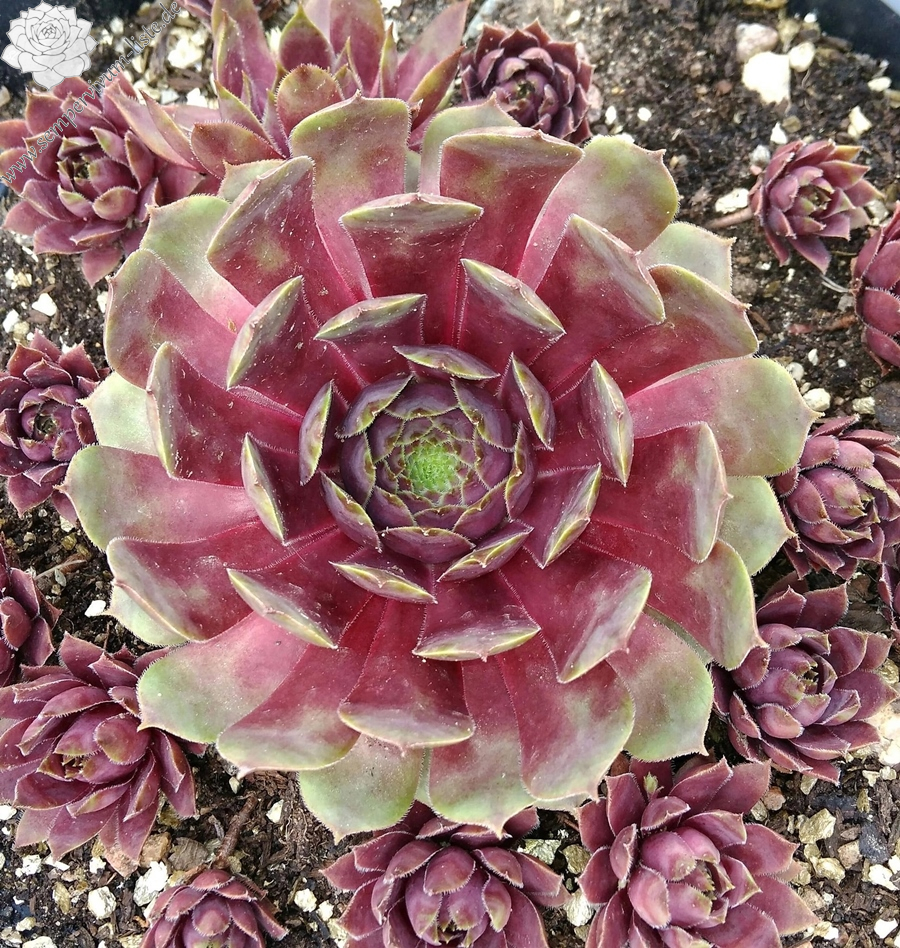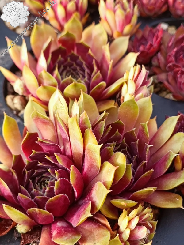 Große Rosetten, im Frühling burgunderrot, wechseln im Sommer ständig ihre Farbe, bleiben aber in leuchtenden Rot-Grün-Tönen erhalten. Bei extremer Hitze treten auch in Töpfen gelbe Farbtöne auf.