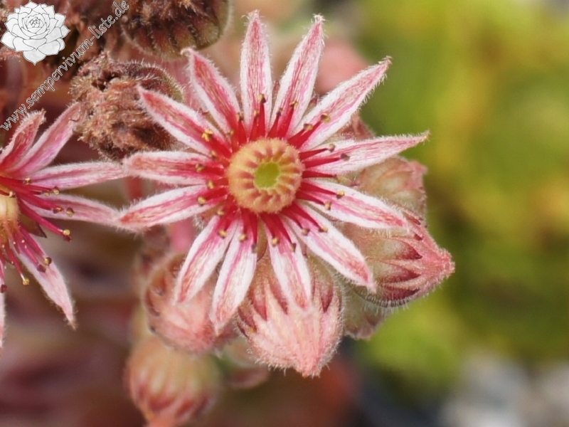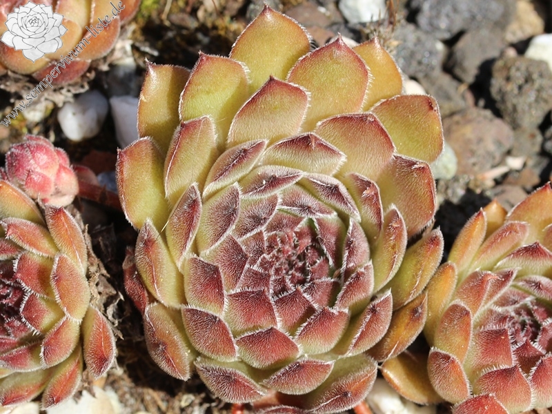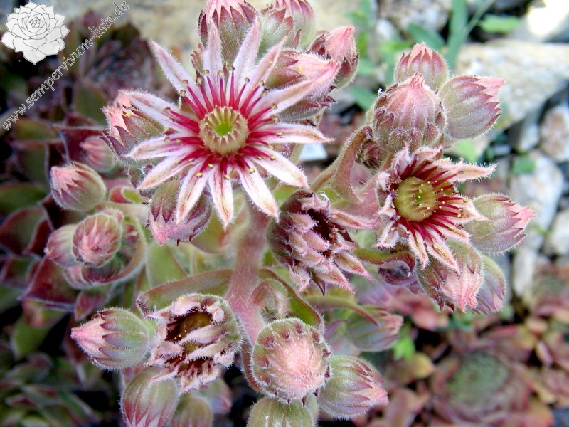 Die grau-rötlichen Rosetten besitzen eine samtige Oberfläche. Im zeitigen Frühjahr besitzen die Pflanzen einen auffallend starken pink-roten Farbton, den sie weit bis in den Sommer behalten. Hellrosa Blüten mit dunkelrosa Mittelstreifen. Gelbgrüne Narbe und rote Staubfäden.