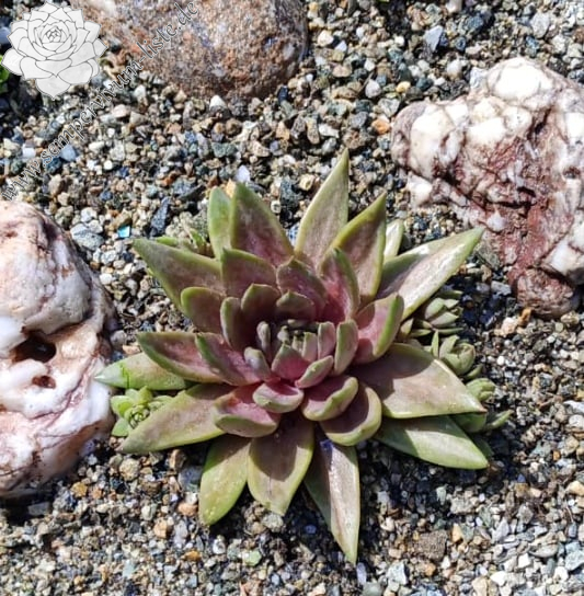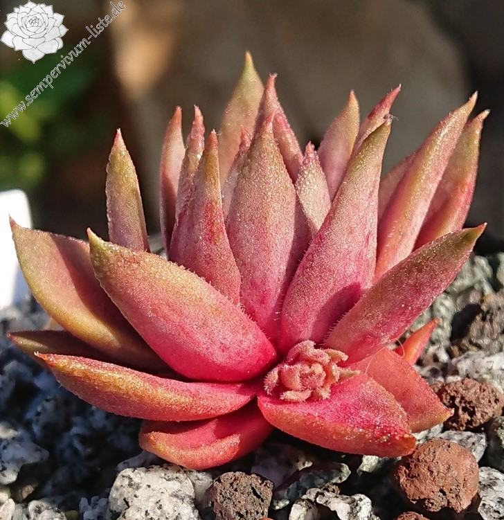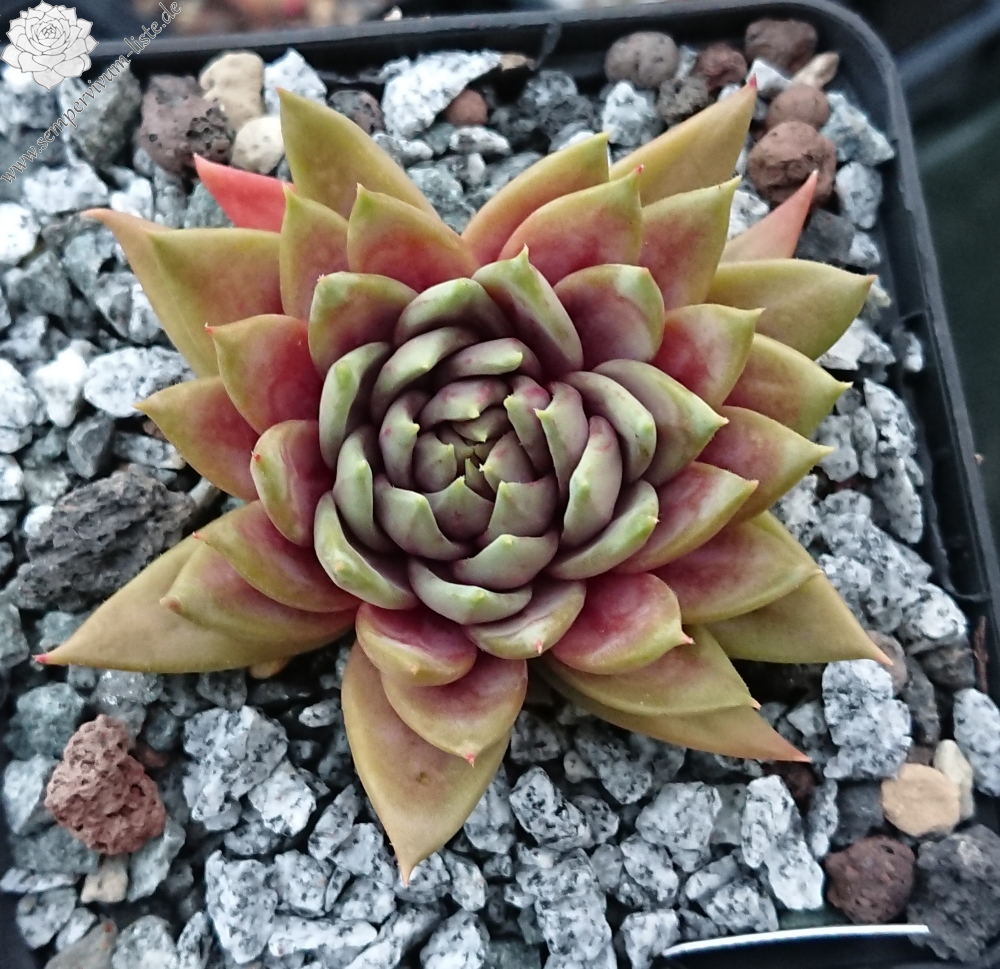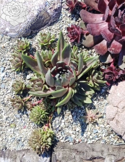 Eine zufällige Mutation von Silver Song mit einem erstaunlich sukkulenten Charakter. Rosetten mit länglichen Blättern, die mehr an Echeveria als an Sempervivum erinnern. Die Färbung ist identisch mit der des Elternteils, aber der rosa-lila Ton auf der Innenseite des Blattes ist intensiver. Reife Rosetten sind leicht „zottelig“ und brechen die richtige Form.