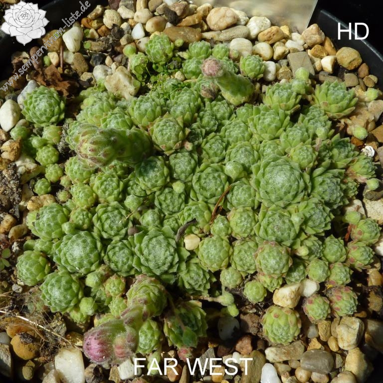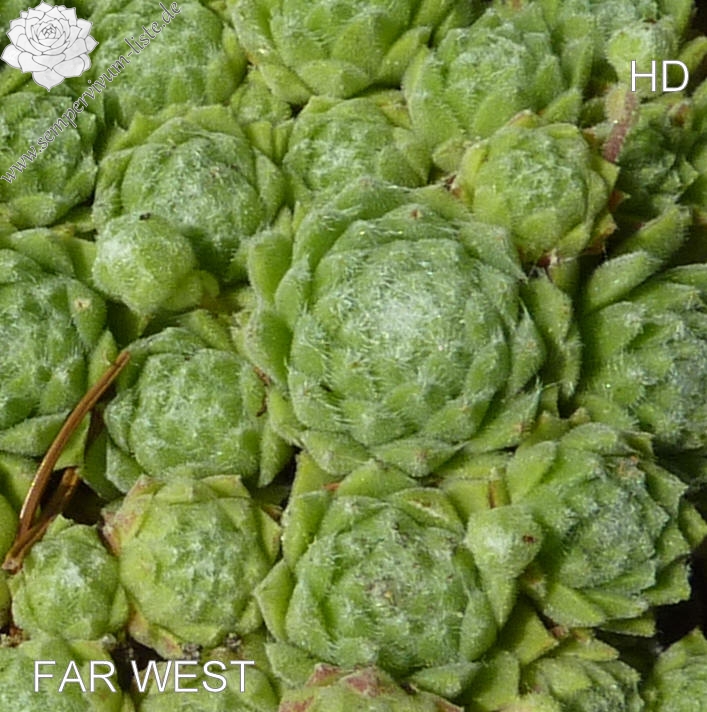 Sempervivum 'Far West' ist ein kleiner, grüner Spinnweb-Hauswurz. Die schönen, hellgrünen Polster mit der nur sehr schwachen Behaarung fallen immer auf. Nach meiner Meinung kann man gar nicht genug Grün in der Sammlung haben. Die Nachfrage nach grünen Sorten ist in den letzten Jahren stark angewachsen! Eine wüchsigen Pflanzen mit sehr viel Charm!
