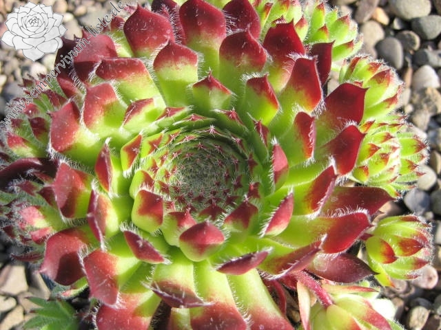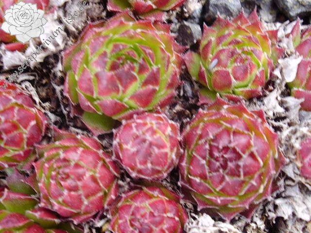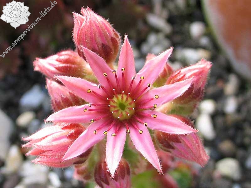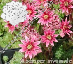 Craigiehall Nursery: Lots of small rosettes, leaves edged with hairs and with red tints. A vigorous natural hybrid that grows without fuss but is attractive too, not just a botanical curiosity. Pretty pink flowers with darker eyes.