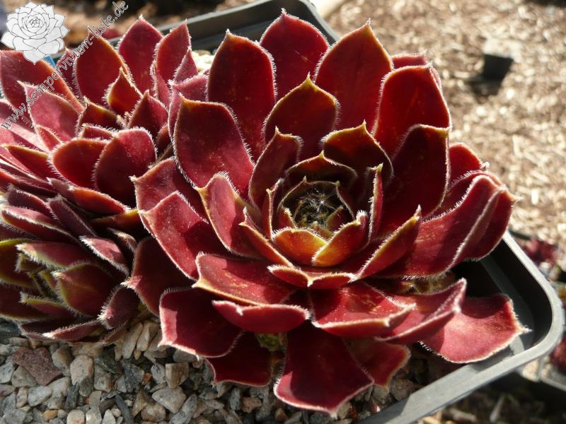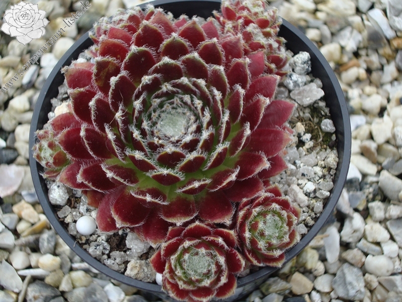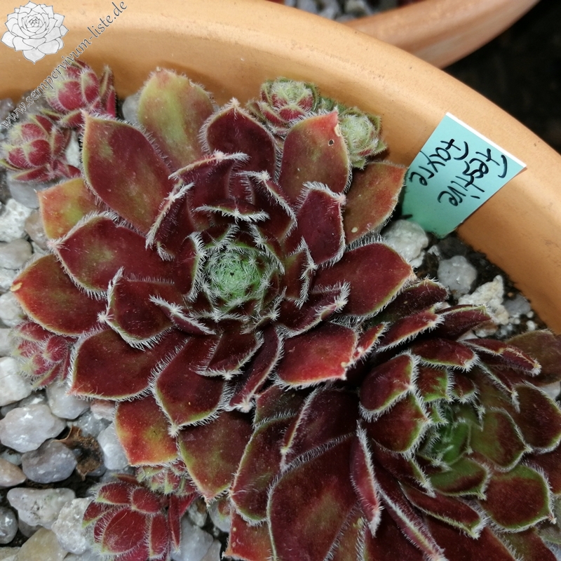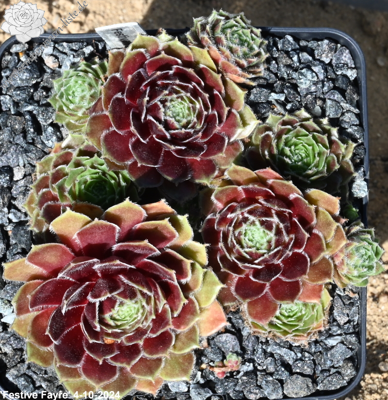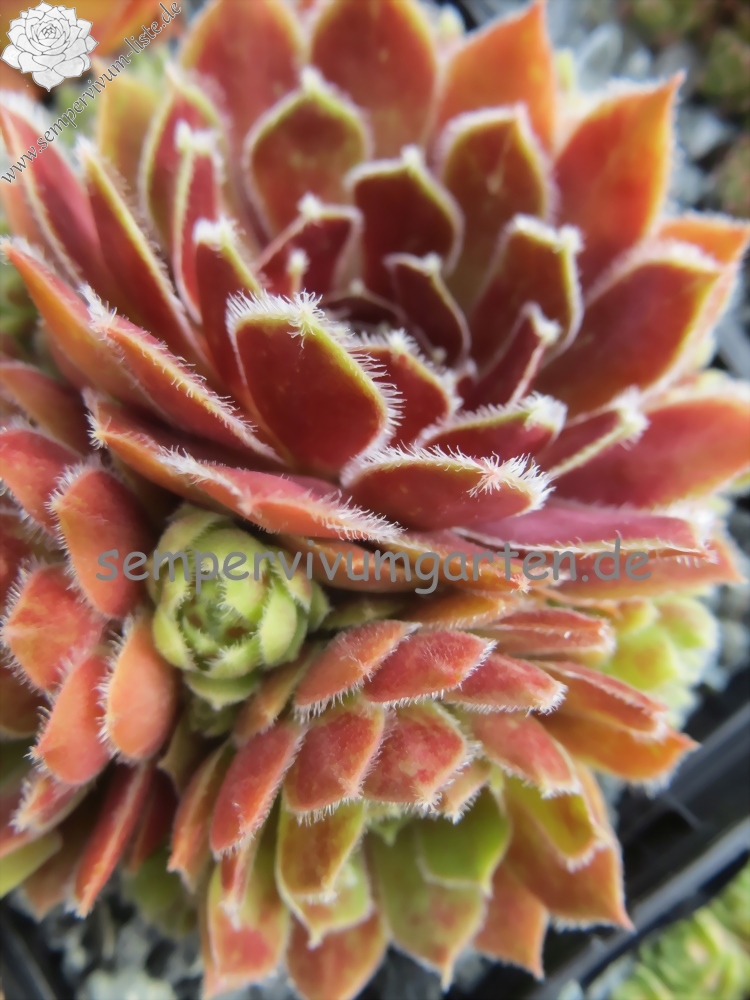 Sempervivum 'Festive Fayre' zeigt schöne, rötlich Blätter mit leichter Behaarung an den Blatträndern. Die Pflanzen sprossen willig.