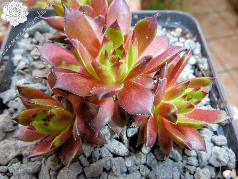 Die Blätter sind sehr spitz und auffallend geflammt. Besonders intensiv zeigt sich das Farbenspiel während des Frühjahrs bis zum Sommeranfang. Aufregend wenn die zahlreichen kleinen Töchter sprießen, denn die kleinen Rosettchen sind in hellem Grün getüncht! Ein toller Kontrast! Die Rosetten erreichen einen Durchmesser von etwa 6 Zentimetern und wachsen sehr kompakt. Die Mutter dieses Sämlings ist 'Zannalee' von der 'Flammenschwert' sein zackiges Aussehen geerbt hat.