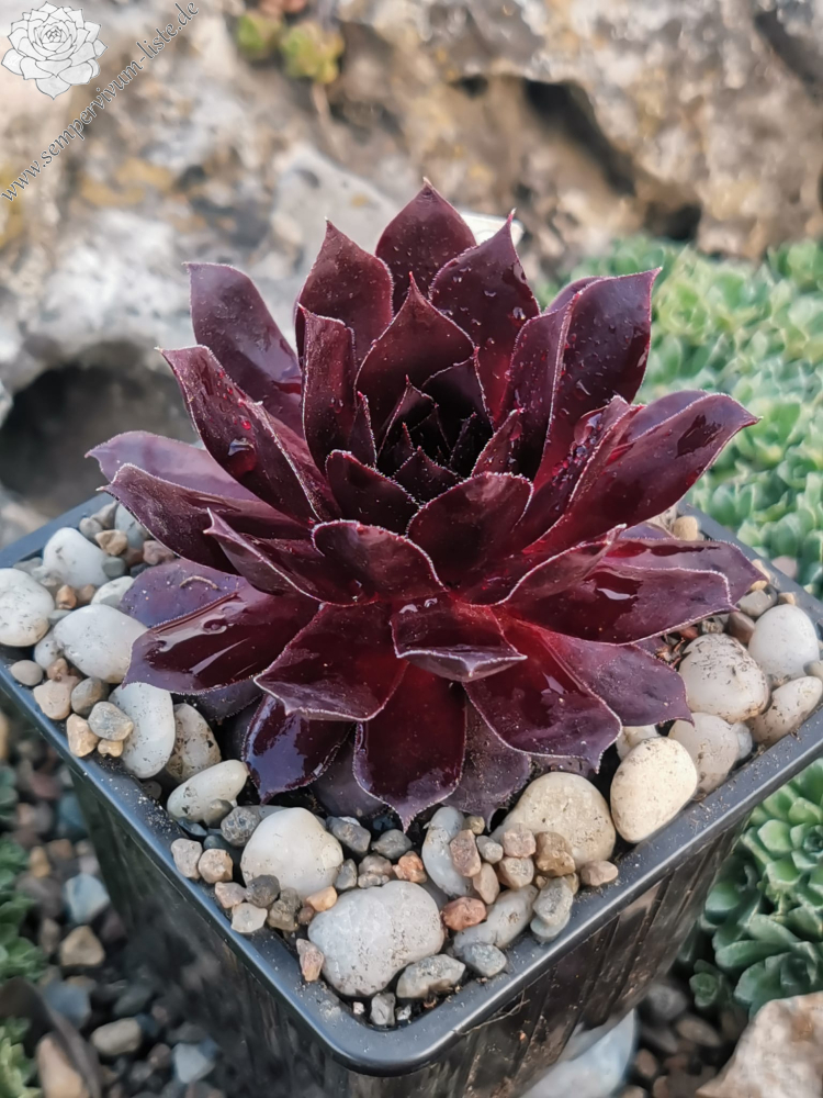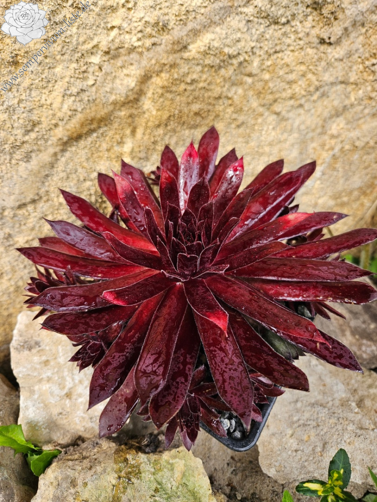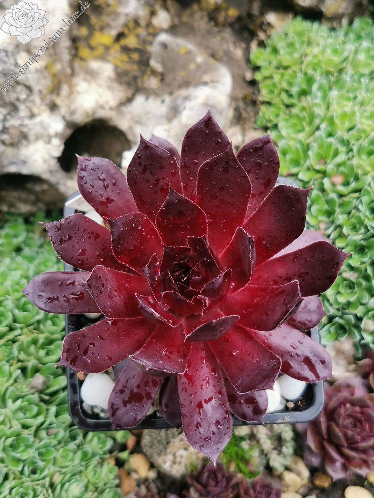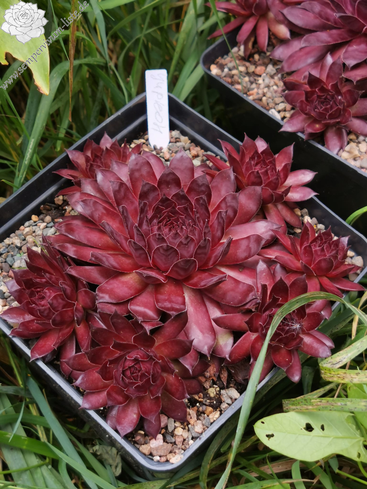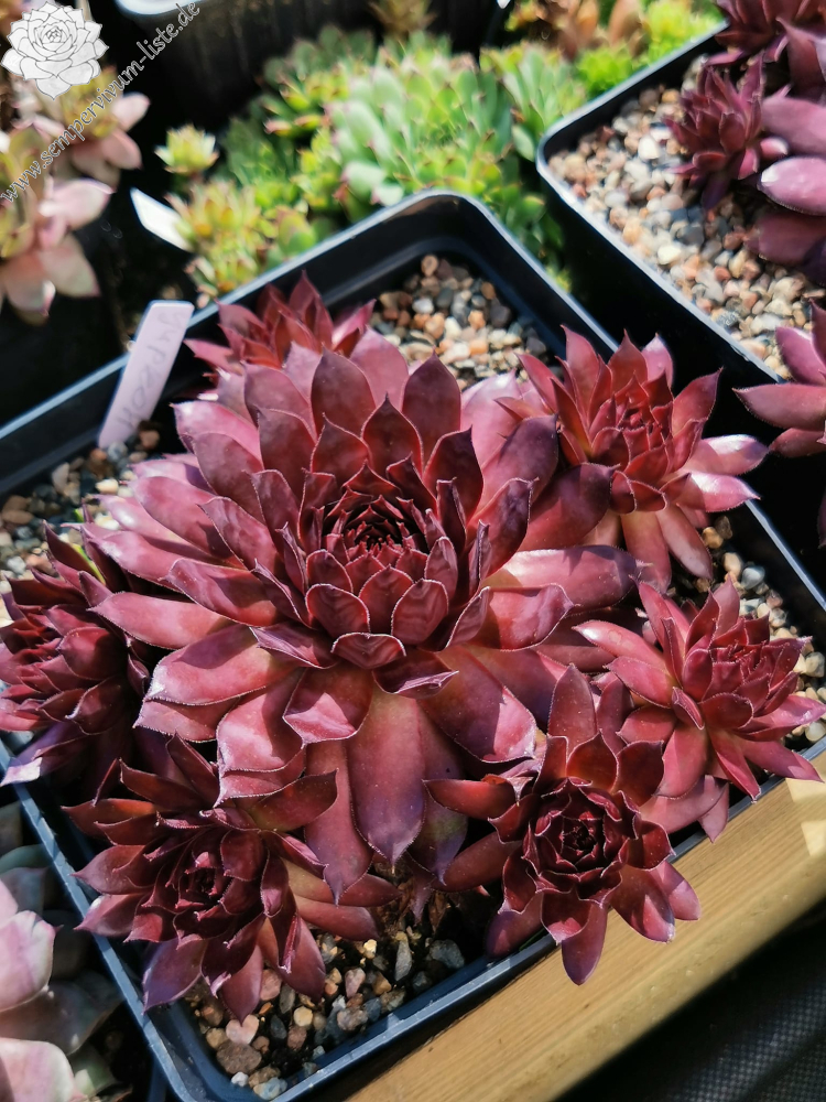 'Furia' sind große, 13 Zentimeter hohe Rosetten in dunklen Lila- und Braun-Burgundertönen, die auch bei extremer Hitze nicht aufhellen. Näher am Hochsommer kommen dunkle Purpurtöne hinzu. Furia sticht durch seine satte, leuchtende Farbe deutlich von anderen Semp-Sorten hervor.