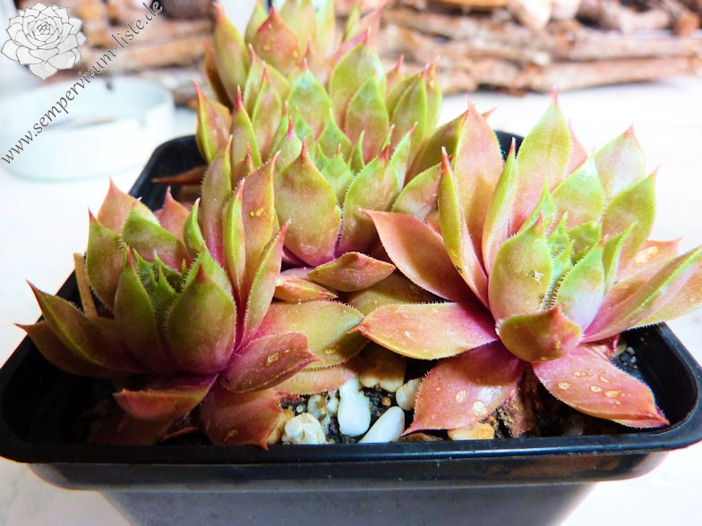 Eine mittelgroße Züchtung mit tollen Farben. Mir gefallen besonders die orangenen Töne auf den äußeren Rosettenblättern. Die Farbe wiederholt sich an den Blattspitzen. Super!