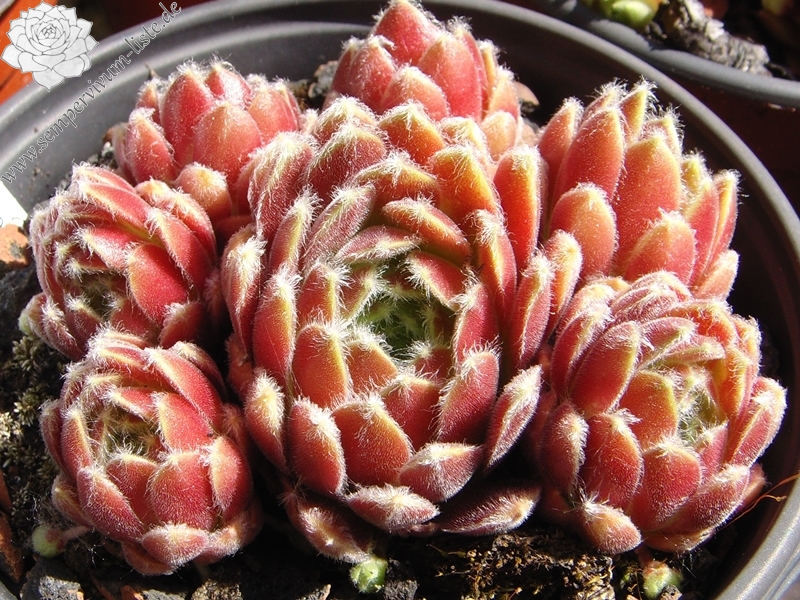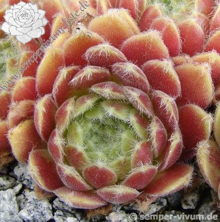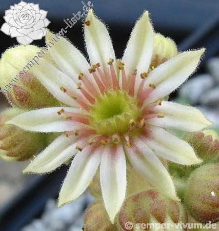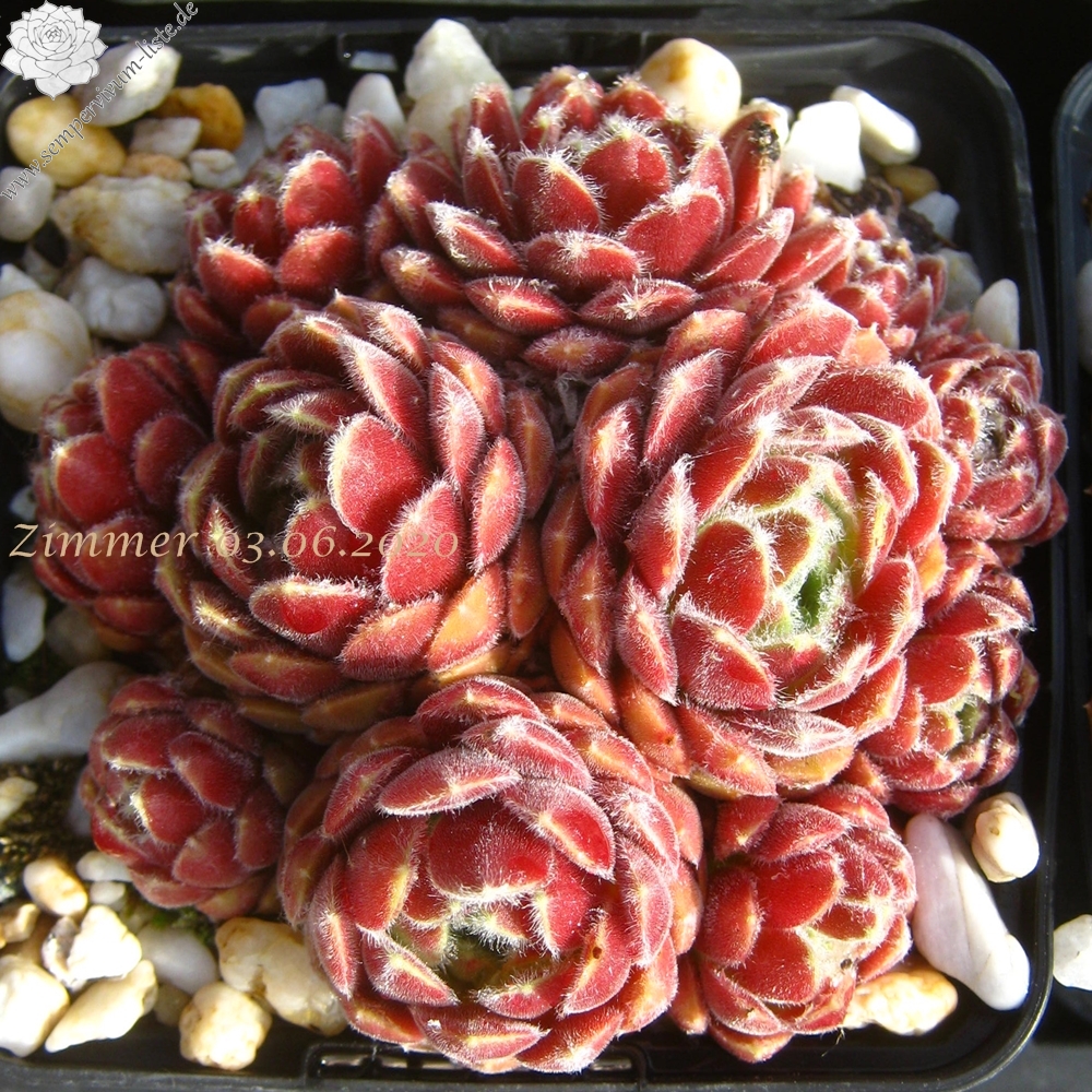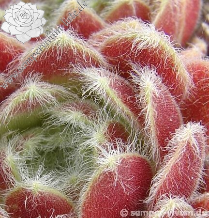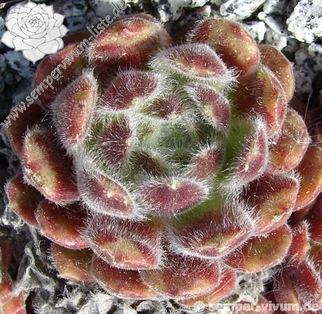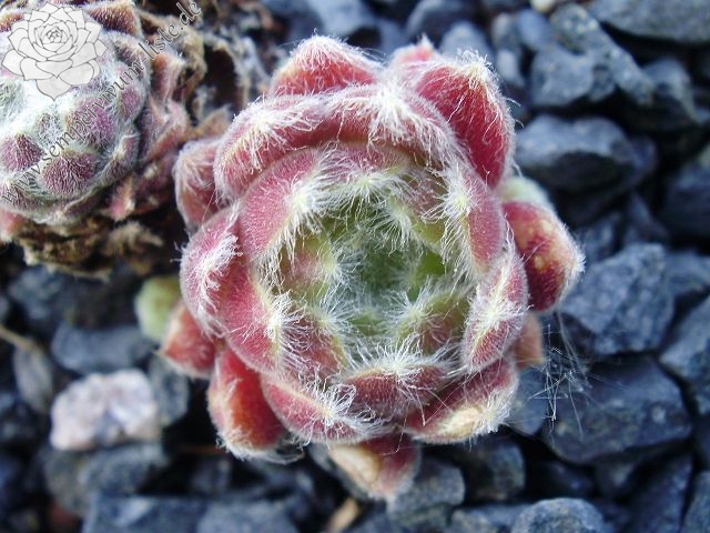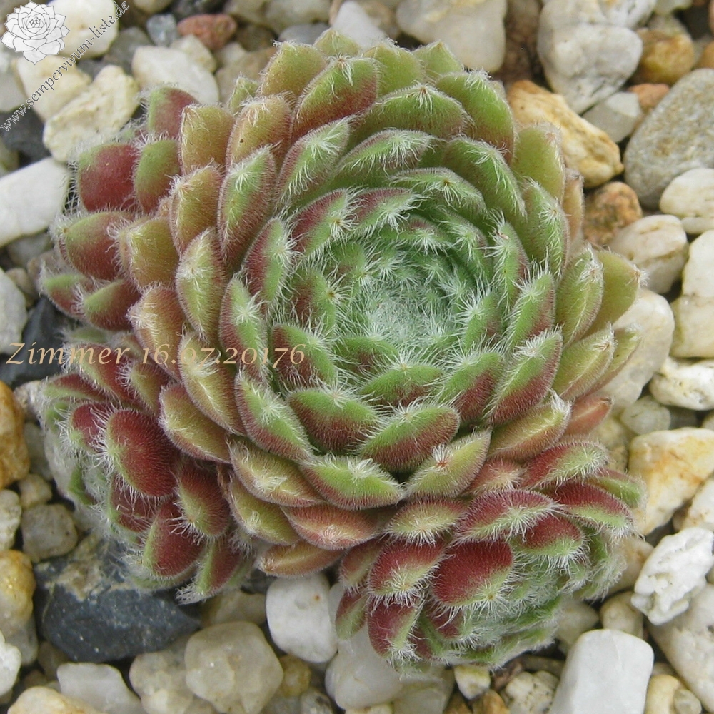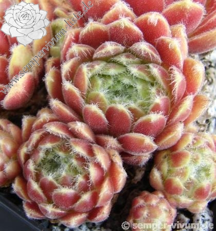 sehr aparte Sorte, mittelgroße, flachrunde, und silbrig behaarte Rosetten, Spitzen ausgeprägt bewimpert, Grund olivgrün, dunkle Spitzen, Blüte rosa, 15 - 20 cm