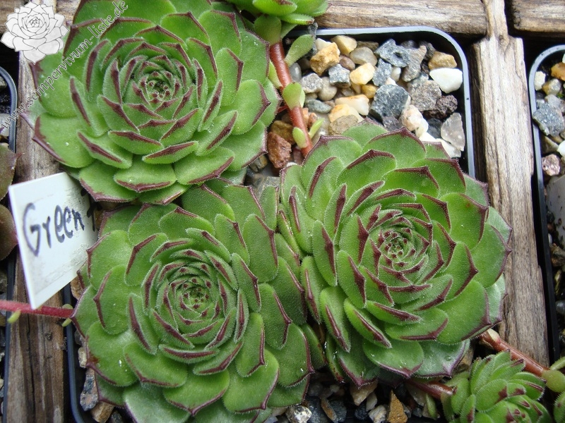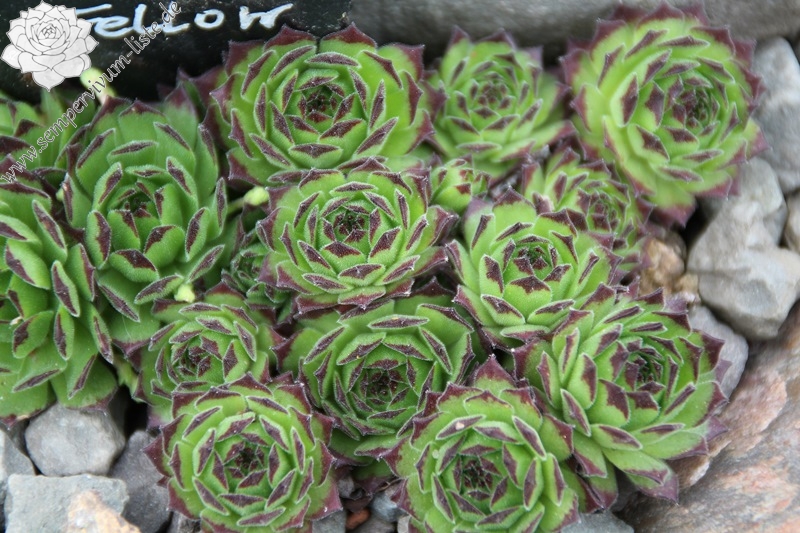 Eine recht neuer Kultivar, wobei S. x christii  'Collecteur Anchisi' (eine Naturhybride von S. grandiflora mit S. montanum) mit der belgischen Hybride 'Zorba' eingekreuzt wurde. Das Ergebnis sind auffallend runde Rosetten mit breitem, grünem Laub mit deutlich abgezeichneten, mahagonifarbenen Blattspitzen. Sehr schön!