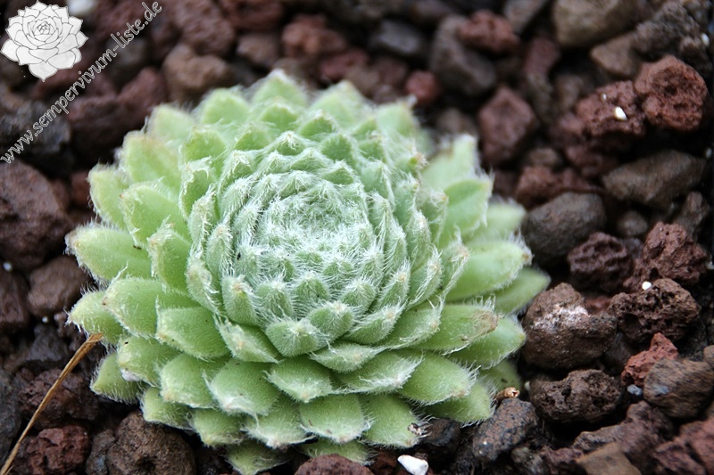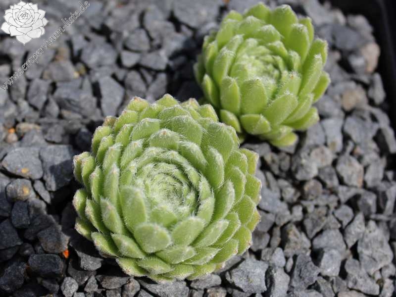 Der Nachwuchs sitzt eng an der halbkugeligen, stark übersponnen Mutterrosette. Die Blätter sind sehr sukkulent, samten und in lindgrüner Farbe. Insgesamt wirken die kompakten Hügelpolster wollig. Eine neuere Züchtung aus Großbritannien.