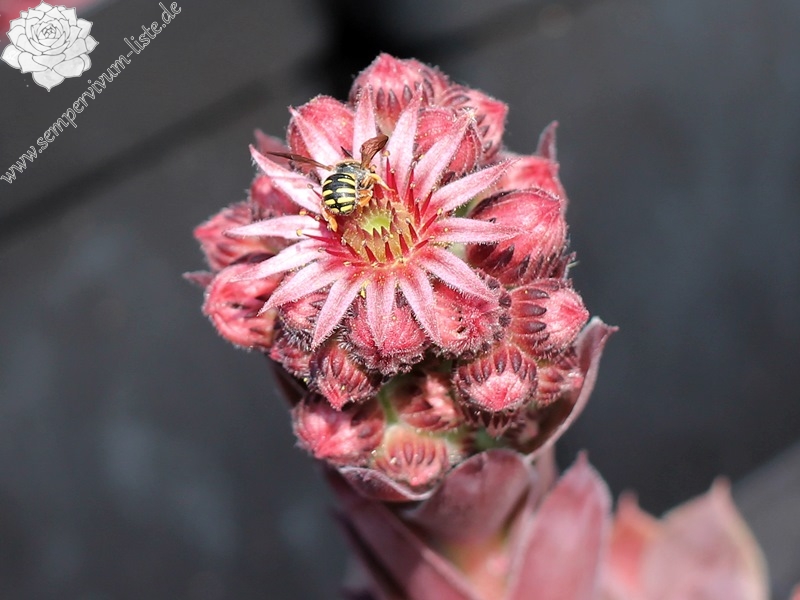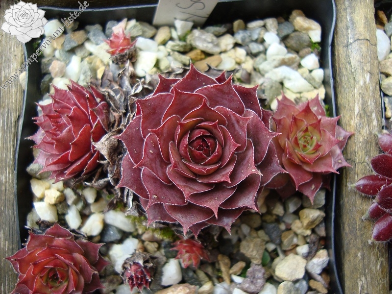 Der "Graue Stern" formt größere, perfekt geformte Rosetten mit einer interessanten Winterfärbung. Die Blätter schmücken sich zu dieser Zeit mit rosafarbenen bis violetten Tönen, der Rand ist leicht silbrig bewimpert.