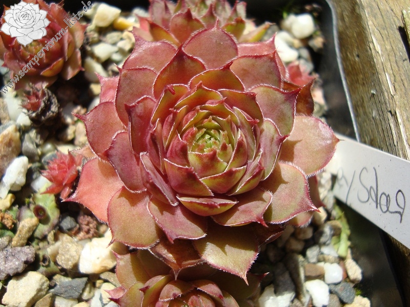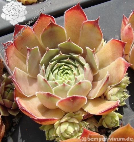 Eine mittelgroße Sorte, die schöne offene Rosetten zeigt. Schön sind die sehr dunkleren Blattränder.